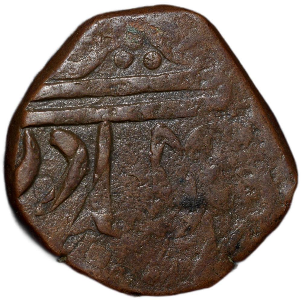 Gwalior State, Jayaji Rao, (AD 1843-1886), Copper Paisa, Burhanpur Mint, Obv: Shah Alam II legends devided by two parellel lines, Rev: Leaf & Snake Mint Mark, 12.74 Gms, 26.98 mm, (KM 45), Seems Double-Struck, About Fine, Rare large flan.