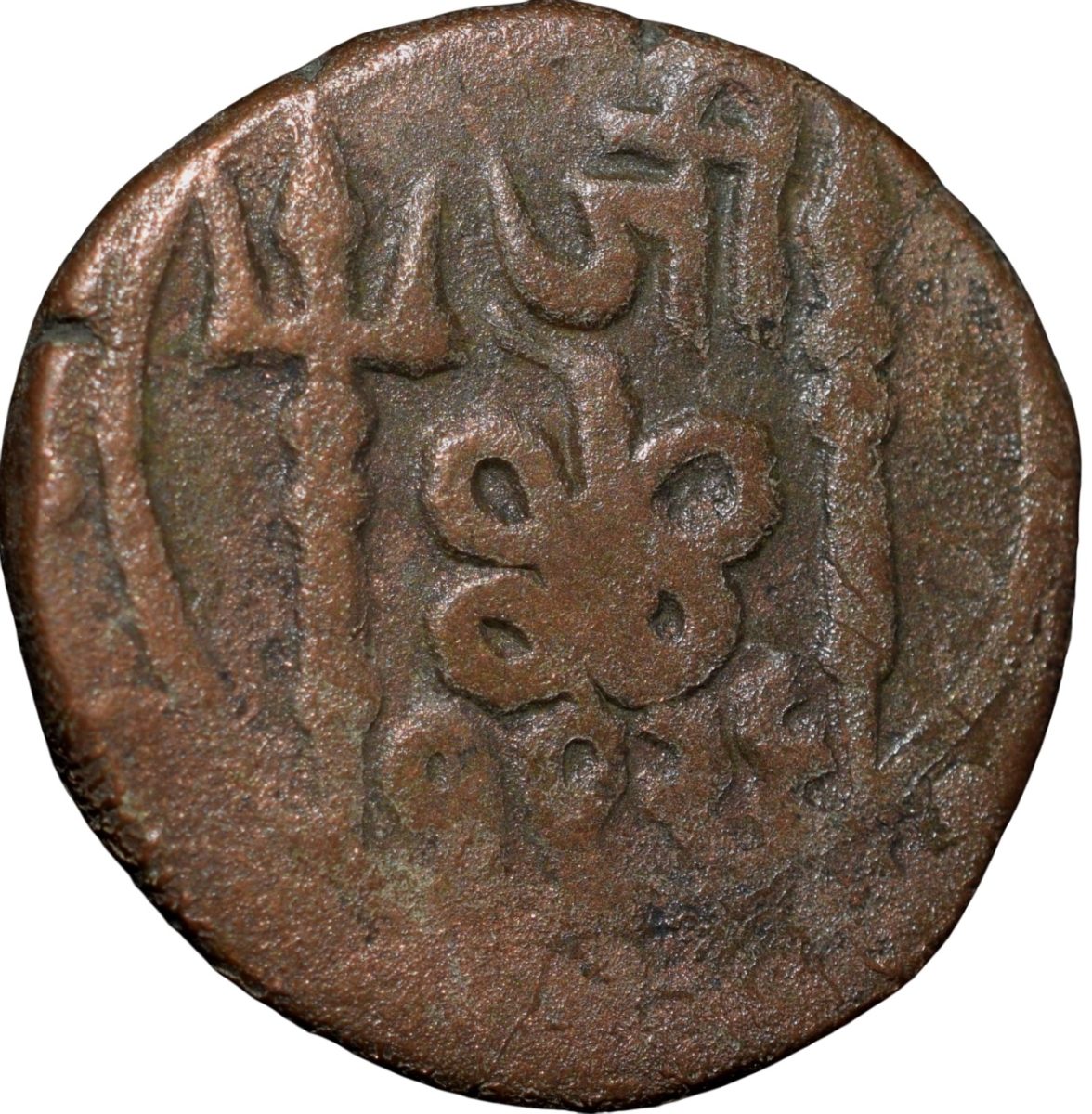 Gwalior State, Jayaji Rao(AH1259-1304/1843-1886 AD), Copper Paisa, Lashkar Mint, Obv: Sprays, Trident, VS1926, Rev: Trident left, Spear right, Nagari ‘Ji’ Top, Snake in centre, VS1926(KM143.1), 6.08 Gms, 16.95 mm, Very fine.