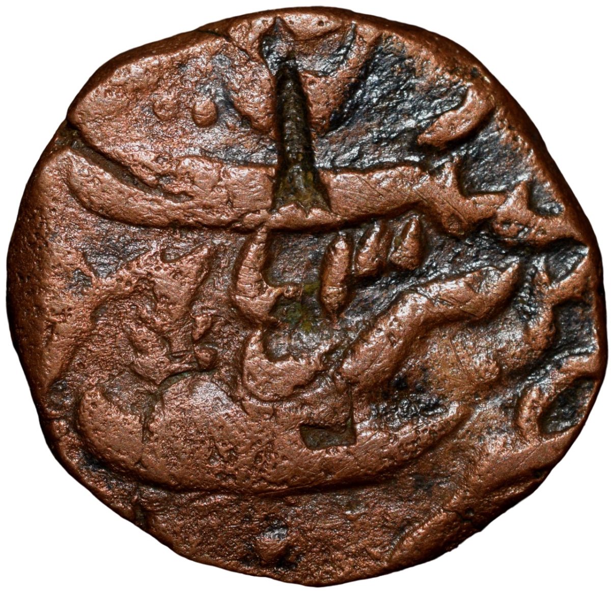 Gwalior State, Mahadji Rao Sindhiya (AH 1175-1209/1761-1794 AD), Copper Paisa, Burhanpur Mint, Obv: Shah Alam II Inscription, Complete dated (AH1206), Rev: Manus maimanat Sanah 32 Zarb Burhanpur, CounterStruck on reverse in ‘Cloves’ Shaped, 20.28 Gms, 22.70 mm, (KM 36), Extremely Fine, Rare.