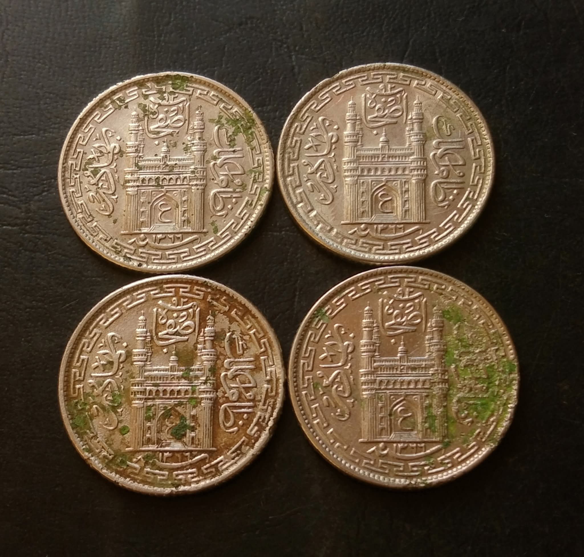 INDIAš®š³ PRINCELY STATE …….. . Nijam CHARMINAR. HYDERABAD STATE š„4;ana 1/4 rs Weight 2.8 gm each 1 CONDITION. Excellent Book on pm 4 piece given Same and similar piece available