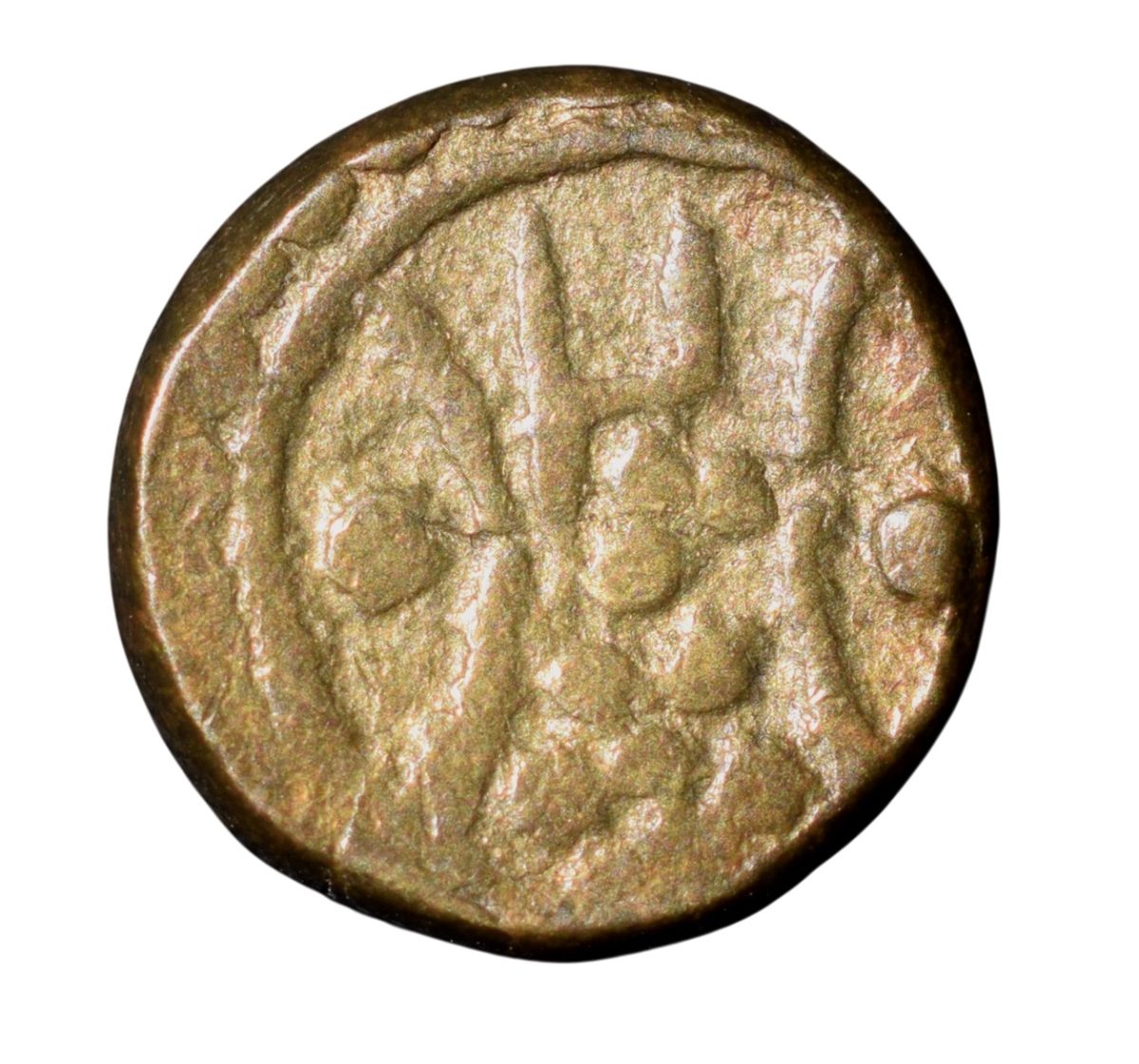Puveera Tokens. (19th Century AD), Brass token, British Period, Obv: Pellets and Characters between two large crescent, Tamil ‘Pu’, Rev: Concentric circles, including a star pattern, 3.06 Gms, 9.70 mm, (Mitch. 1287-1289), Very Fine.