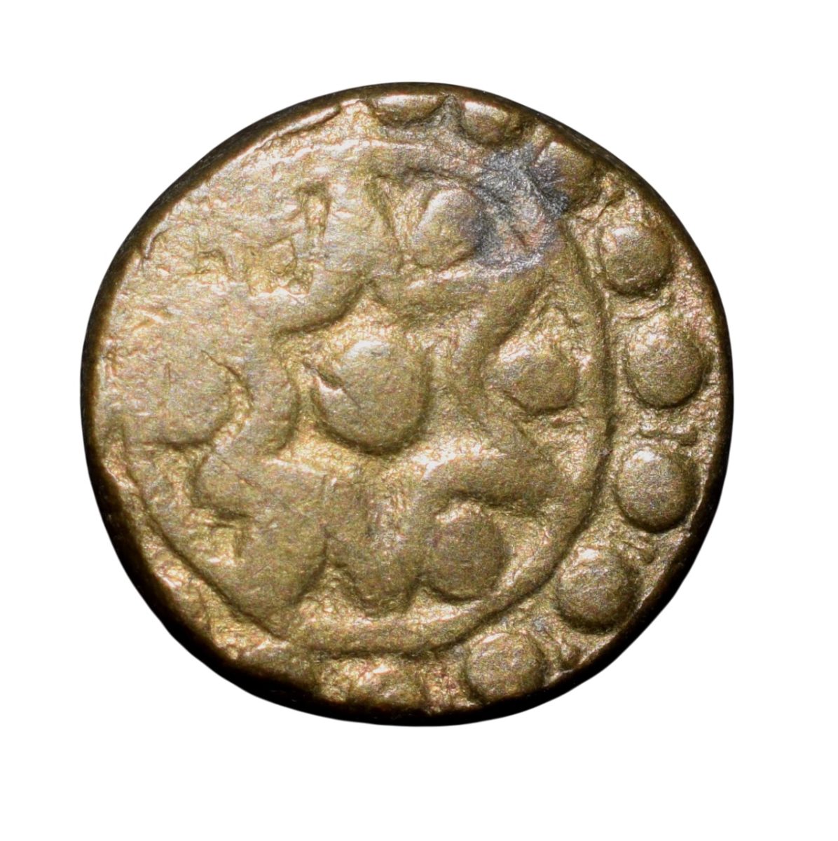 Puveera Tokens. (19th Century AD), Brass token, British Period, Obv: Pellets and Characters between two large crescent, Tamil ‘Pu’, Rev: Concentric circles, including a star pattern, 3.06 Gms, 9.70 mm, (Mitch. 1287-1289), Very Fine.