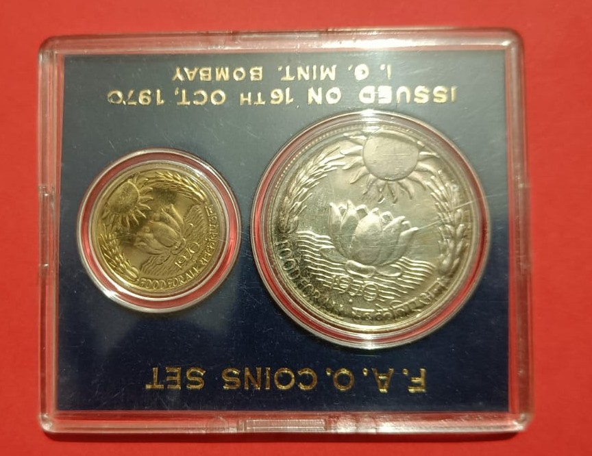 10 Rs 20 Paise and 10 Rs FAO Set Coin Ex. Rare I G Mint Bombay 1970 with certificate and original cover