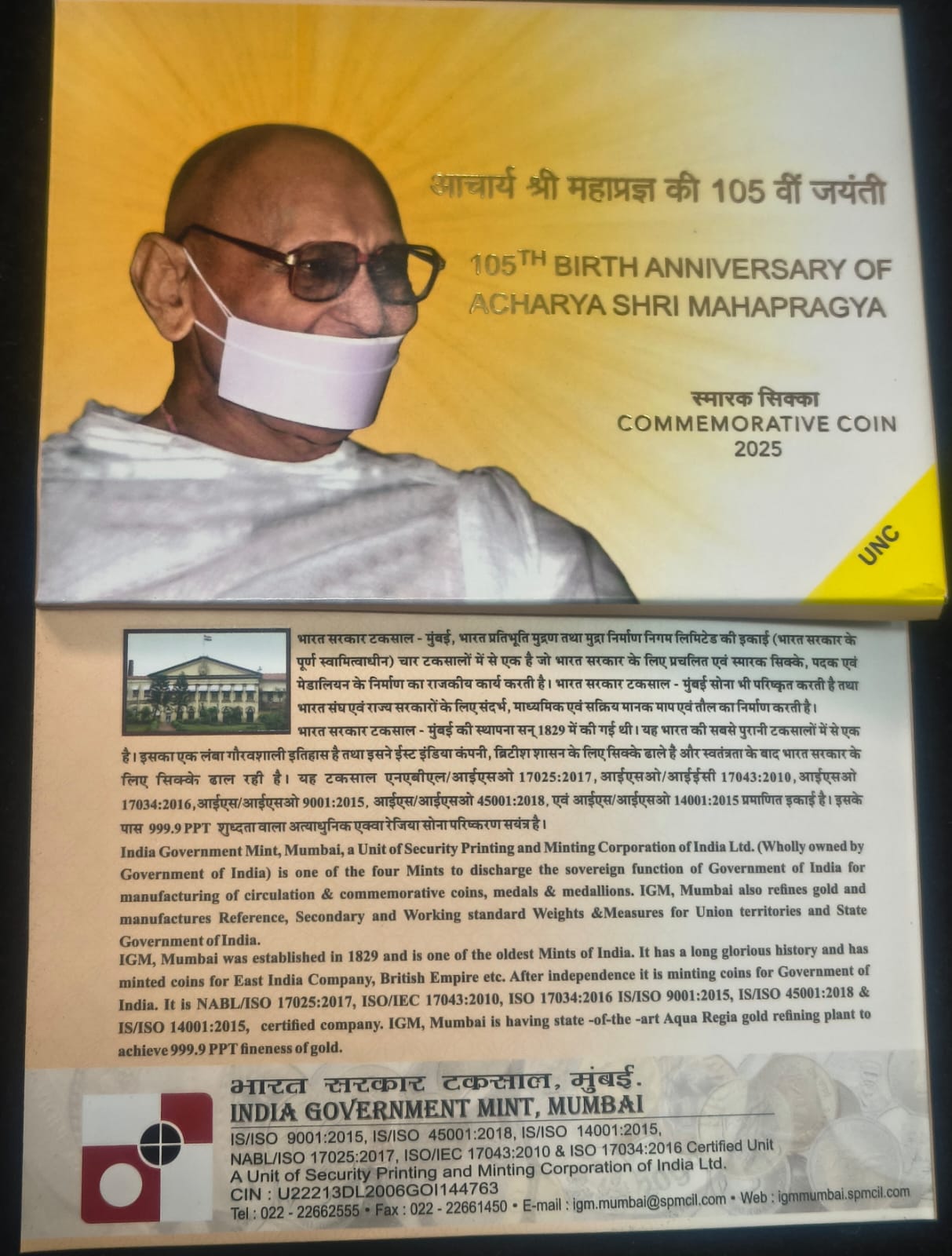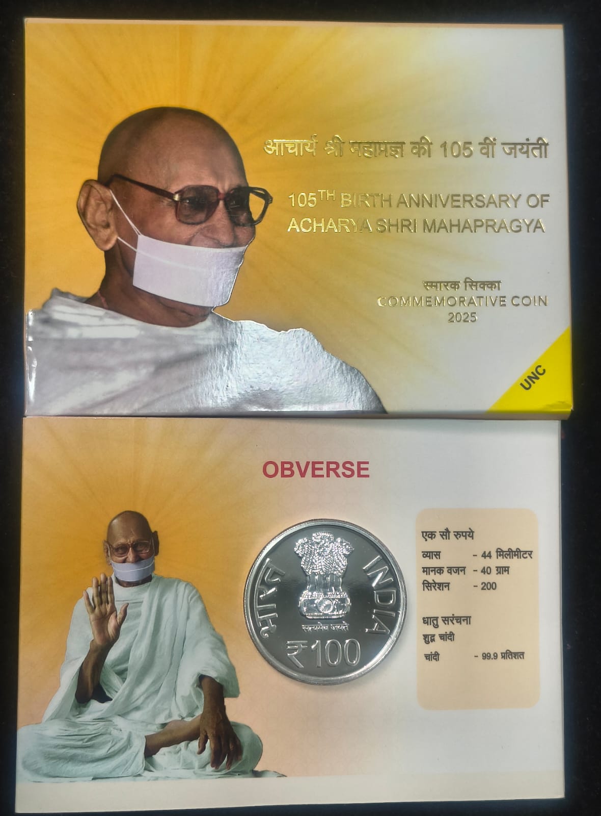 105th Birth Anniversary of Acharya Shri Mahapragya 2025 Mumbai Mint (40 Gram Silver) Rare UNC SET