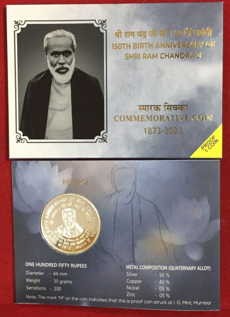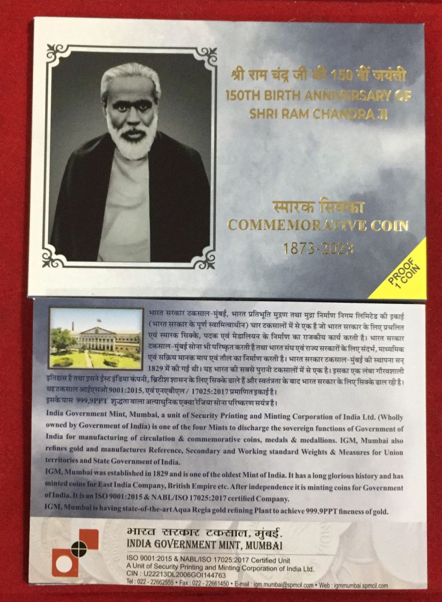 Celebrate the 150th birth anniversary of Shri Ram Chandra Ji with this exquisite Mumbai Mint Proof coin set. Issued by the Bombay Mint (Mumbai), this rare set comprises a single coin showcasing intricate craftsmanship and historical significance. Struck in a high-grade metal, this collectible piece is a testament to the rich numismatic heritage of India. The coin commemorates a significant milestone in the life of Shri Ram Chandra Ji, offering a glimpse into a revered spiritual figure’s legacy.