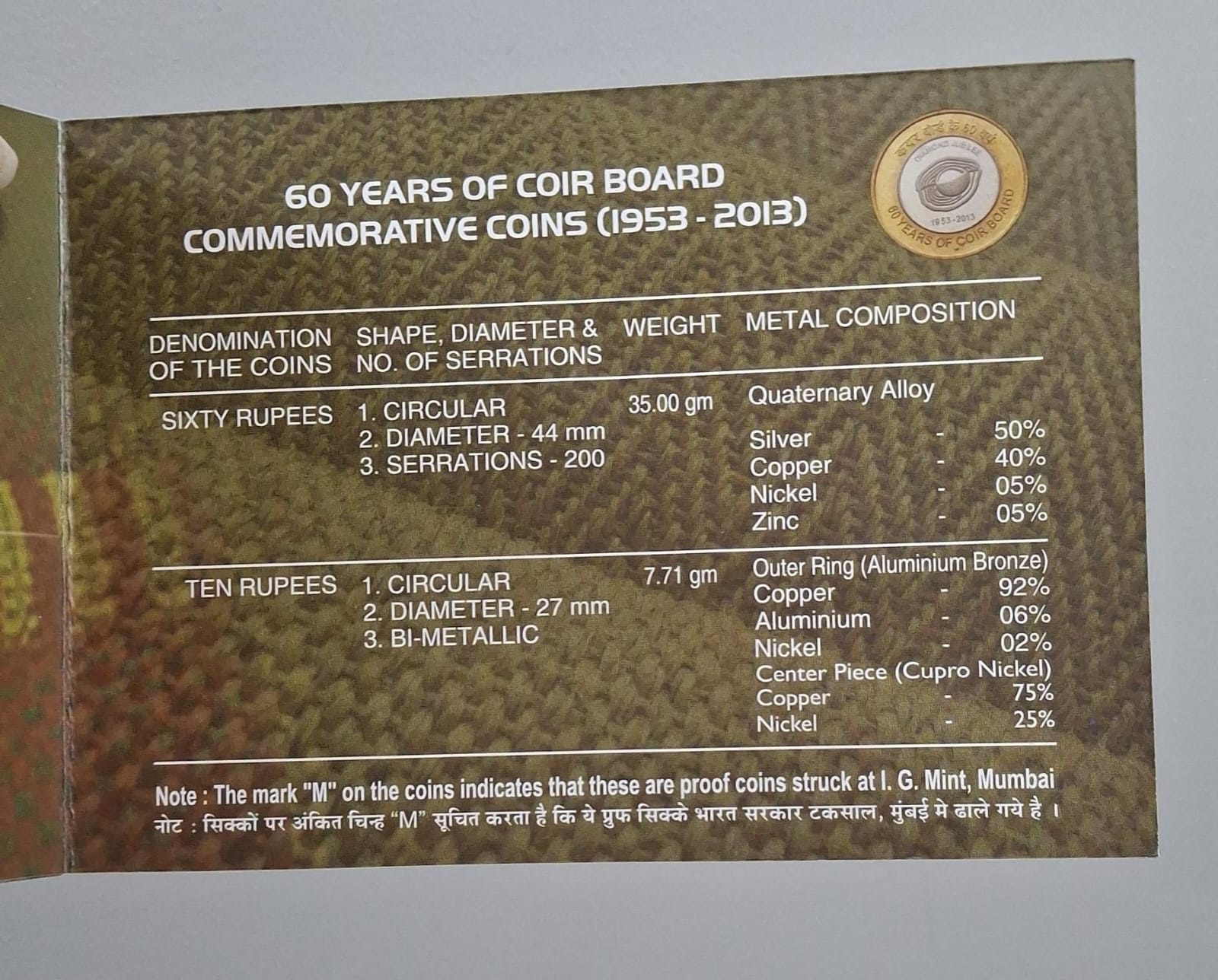 60 YEARS OF COIR BOARD (1953-2013) RARE 2 COIN (PROOF SET) MUMBAI MINT