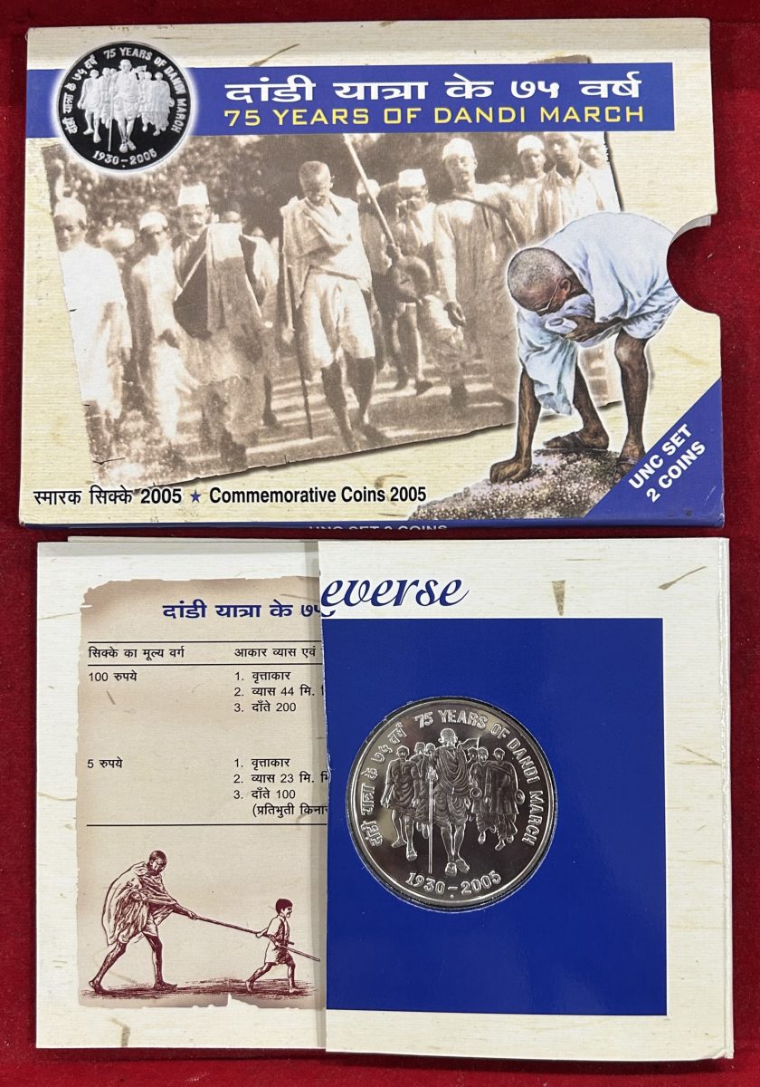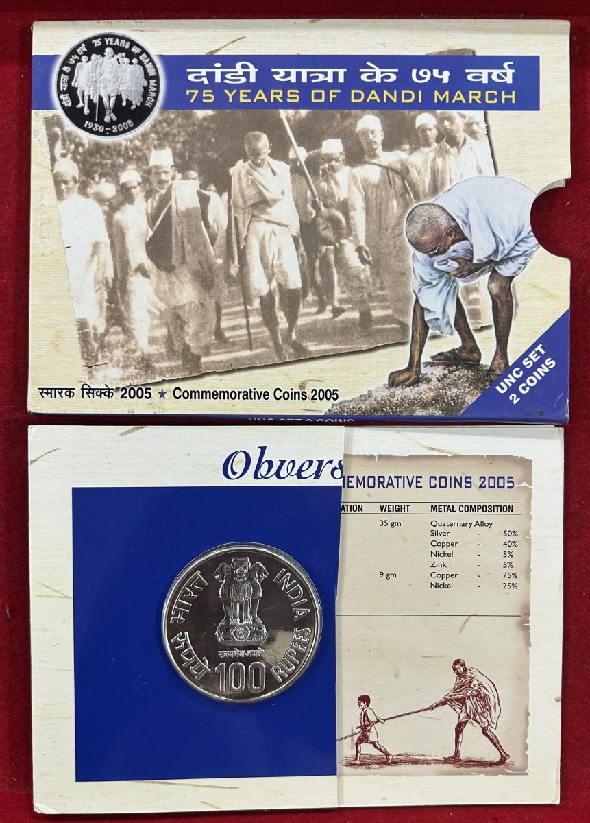 75 Years Of Dandi March 100 Rupees SILVER Commemorative Mumbai Mint Coin 2005 ( 5 Rupees Coin Missing )