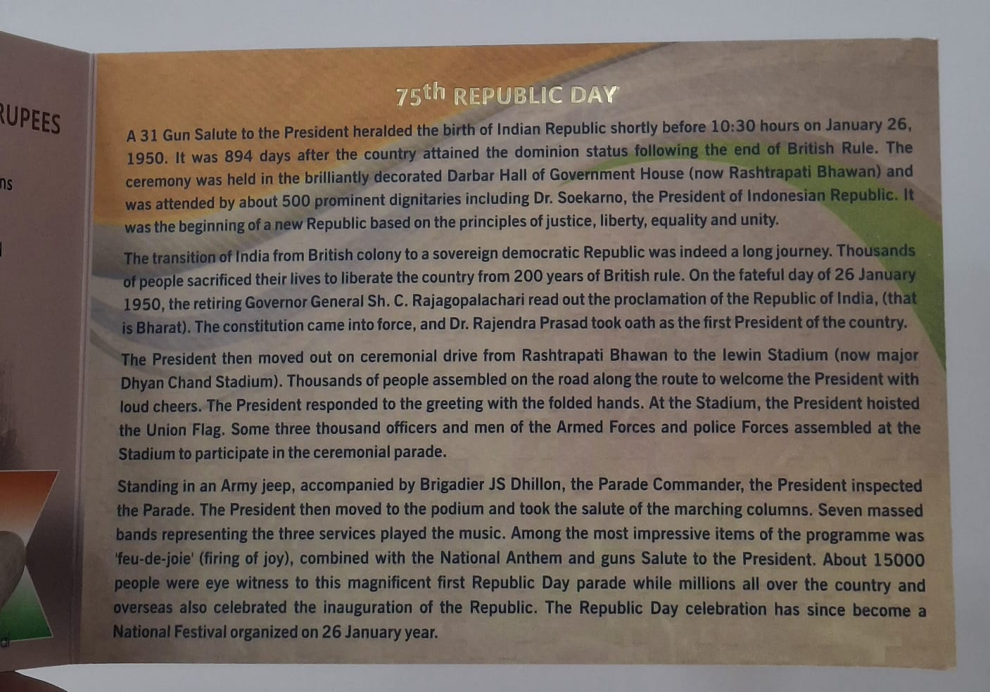राष्ट्रपति को 31 तोपों की सलामी के साथ 26 जनवरी, 1950 को 10:30 बजे से कुछ समय पहले भारतीय गणतंत्र के जन्म की घोषणा की गई। ब्रिटिश शासन के अंत के 894 दिन के बाद देश को संप्रभुत्व का दर्जा प्राप्त हुआ। यह समारोह गवर्नमेंट हाउस (अब राष्ट्रपति भवन) के शानदार ढंग से सजाए गए दरबार हॉल में आयोजित किया गया था और इसमें इंडोनेशियाई गणराज्य के राष्ट्रपति डॉ सुकर्णो सहित लगभग 500 प्रमुख गणमान्य व्यक्तियों ने भाग लिया था। यह न्याय, स्वतंत्रता, समानता और एकता के सिद्धांतों के आधार पर एक नए गणराज्य की शुरुआत थी।