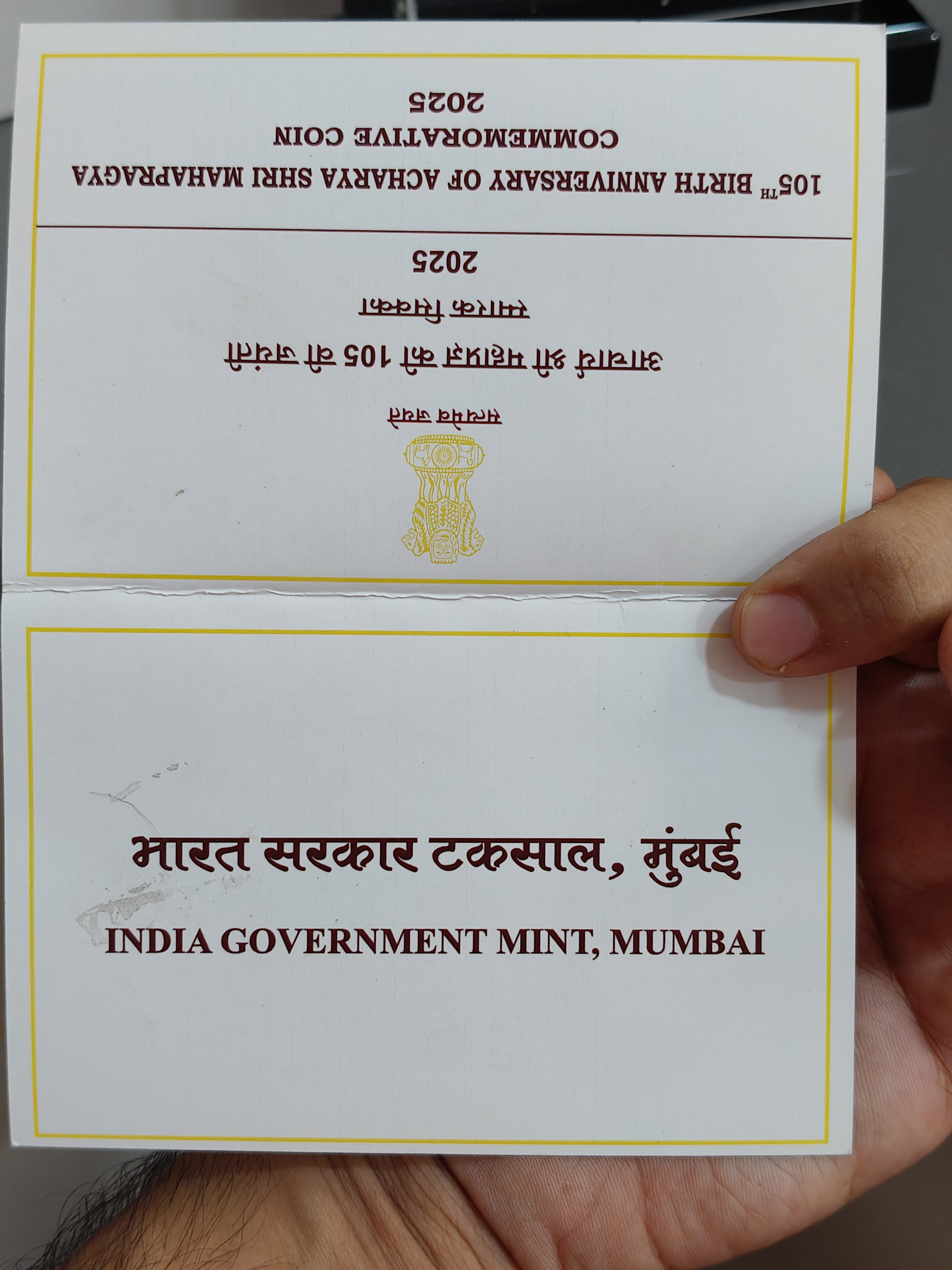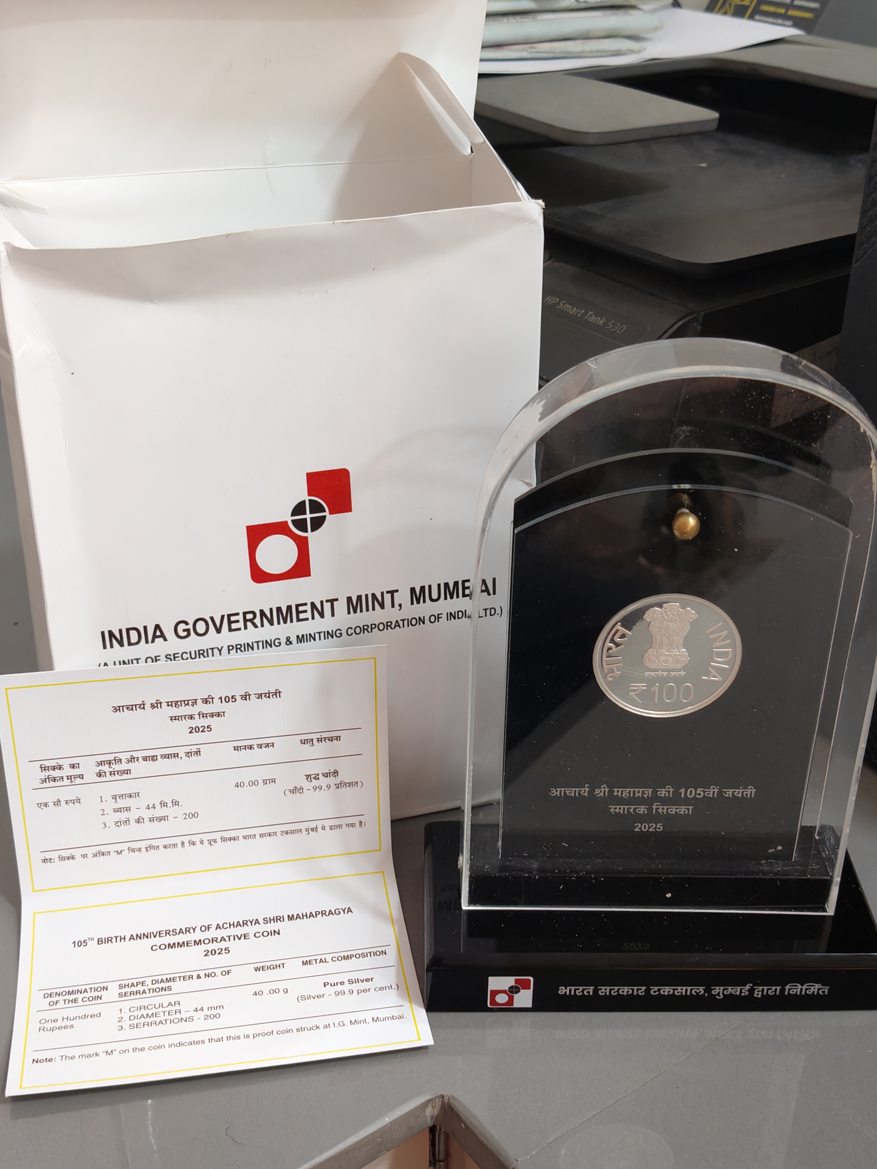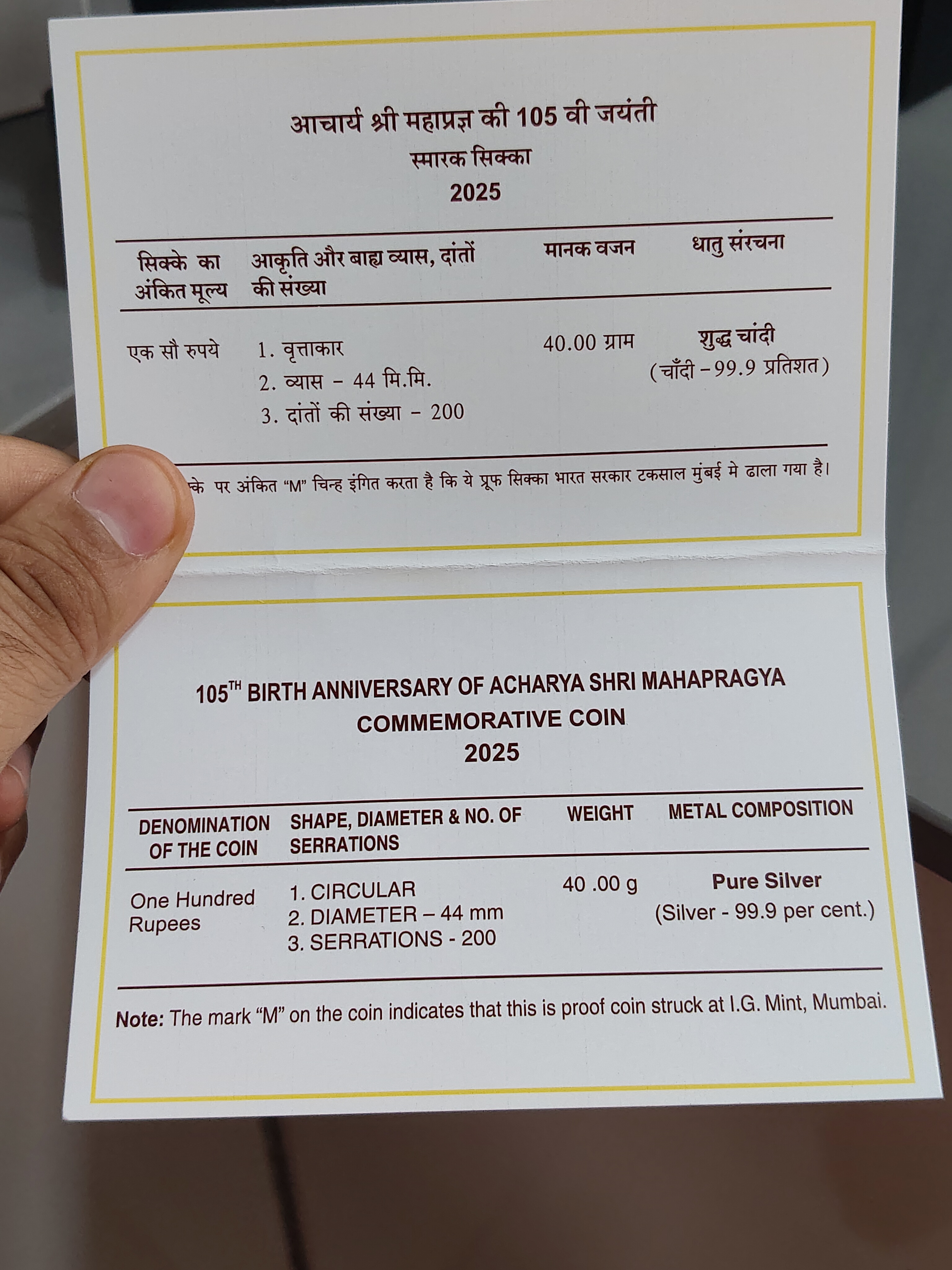 Acharya Shri Mahapragya 2025 100 Ruppes vip set with certificate and cover