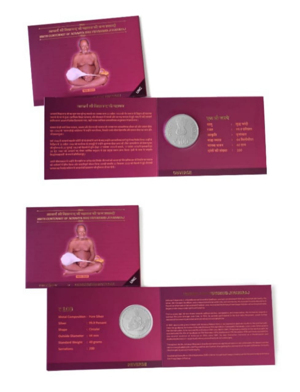 BIRTH CENTENARY OF ACHARYA SHRI VIDYANANAND JI MAHARAJ 2025 (40 GRAM SILVER) HYDERABAD MINT RARE UNC SET