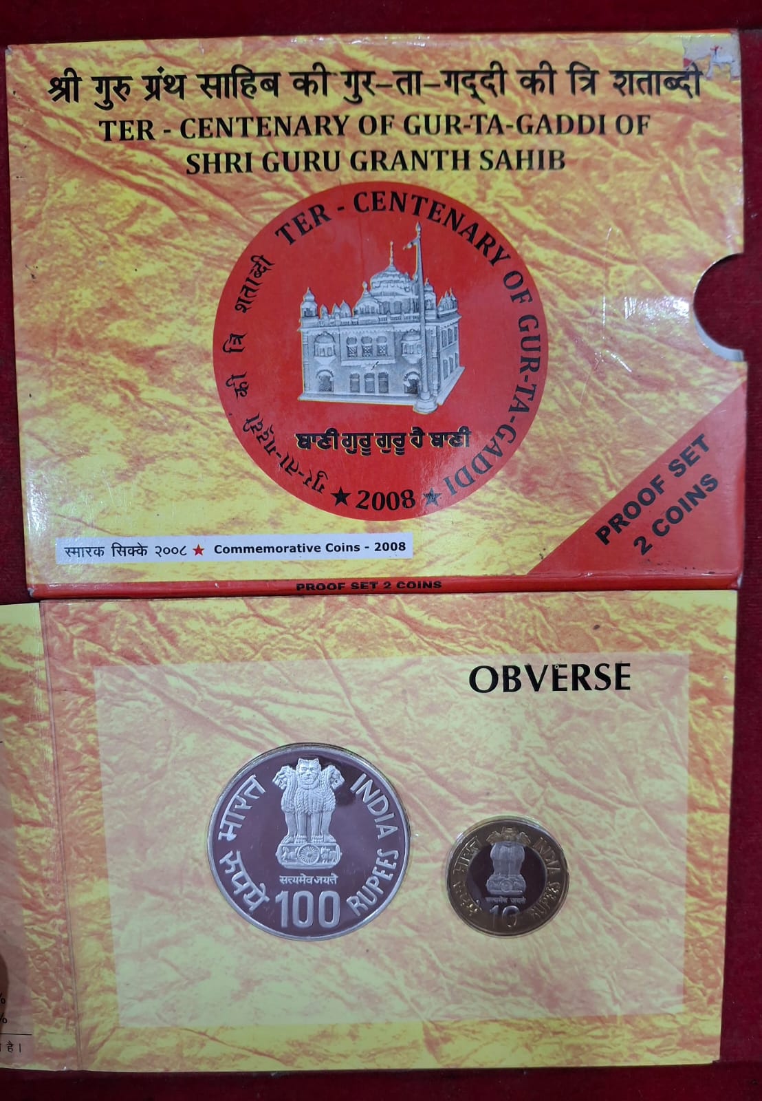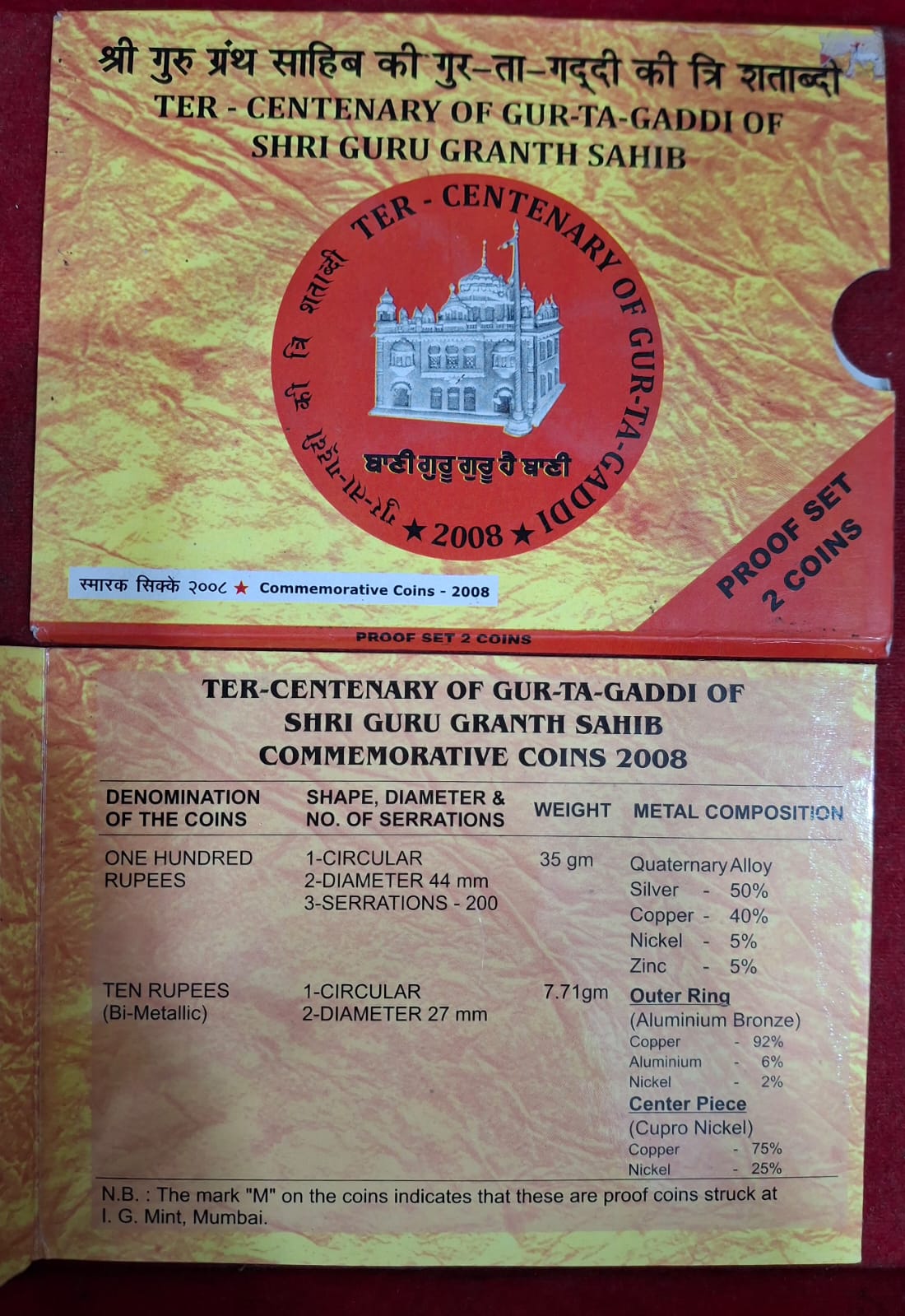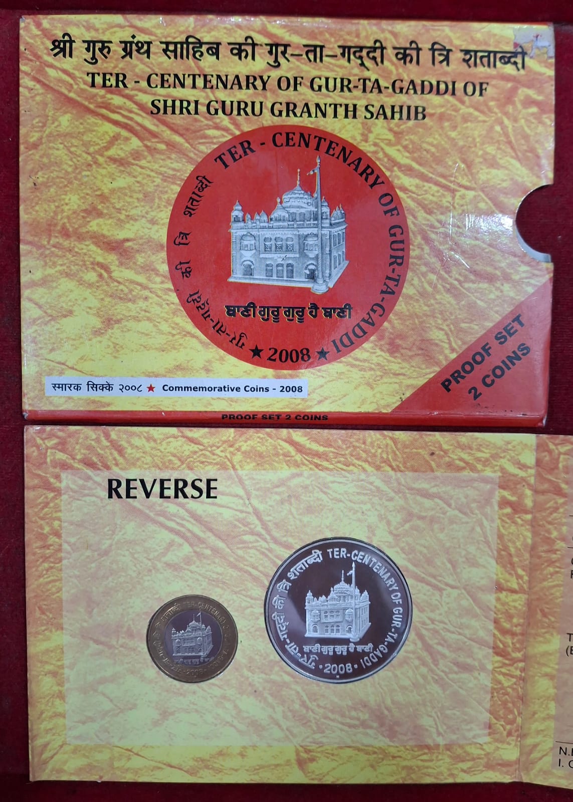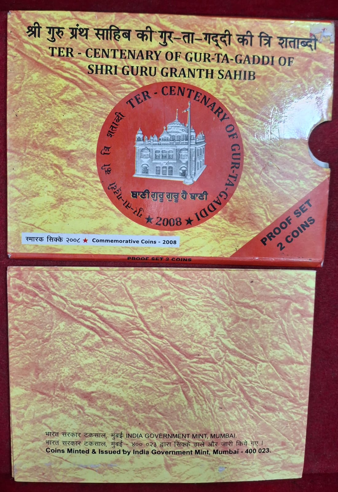 2 COINS Set of Gur Ta Gaddi of Shri Guru Granth Sahib PROOF Set MUMBAI Mint Set Issued in 2008