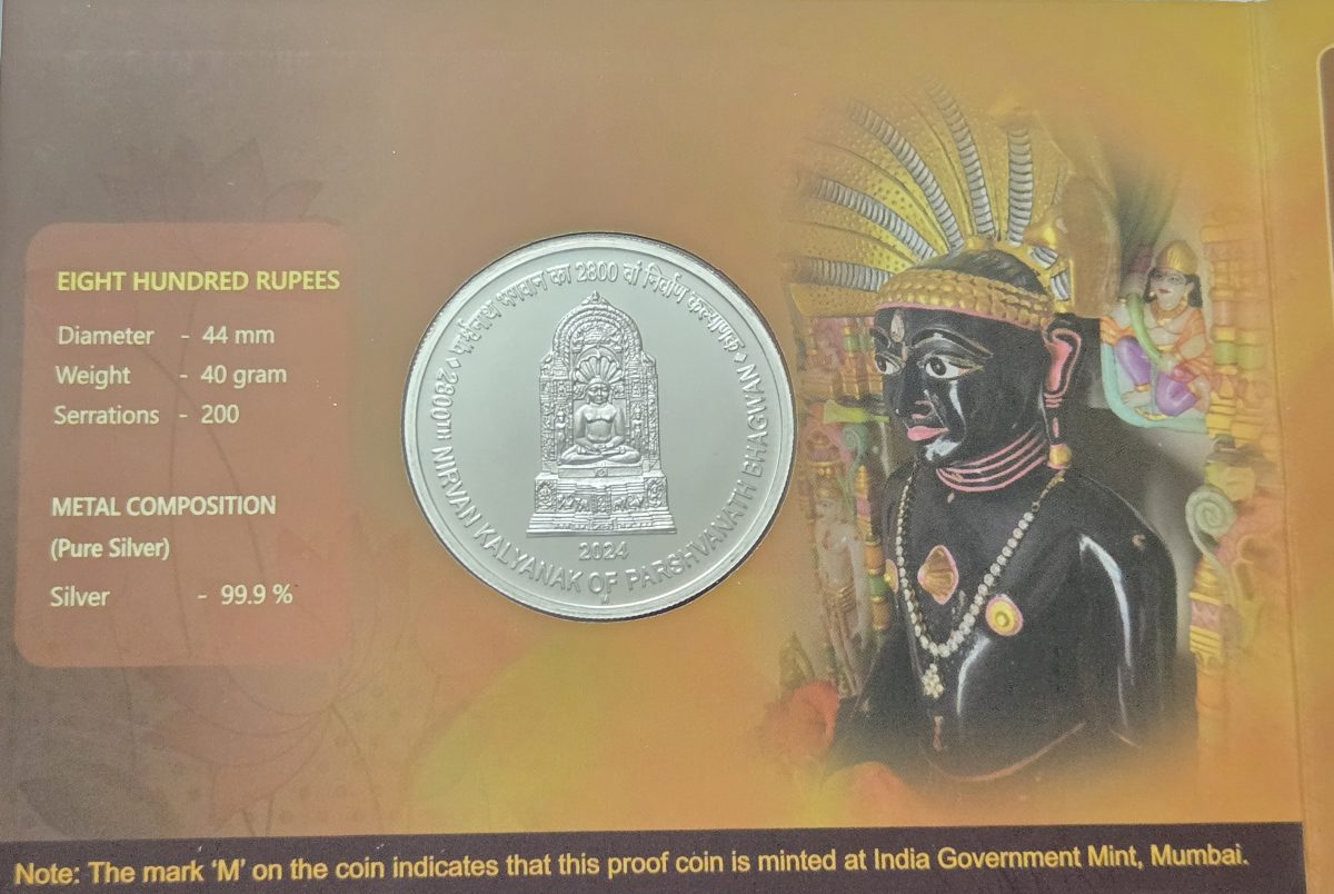 Step into the world of numismatics with the exquisite 2800th Nirvan Kalyanak Of Parshvanath Bhagwan 800 Rs M Mumbai Mint Proof Silver Coin. This stunning silver coin, minted by the renowned Bombay Mint in Mumbai, commemorates a significant milestone in Jain history. Struck with precision, this coin holds a denomination of 800 Rs and is a testament to the craftsmanship of the mint. The design features intricate details honoring the Nirvan Kalyanak of Parshvanath Bhagwan, making it a prized possession for collectors and enthusiasts alike. With its limited mintage and proof finish, this coin is not only a valuable addition to any collection but also a piece of history to be cherished. The coin comes encapsulated in a protective case, ensuring its pristine condition and authenticity.