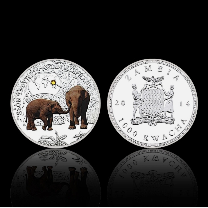 The Extremely Rare 1000 KWACH 2014 Year Asian Elephant coin from the Republic of Zambia is a highly sought-after collector’s item. Minted in 2014, this proof coin features an exquisite design showcasing the majestic Asian Elephant, a symbol of strength and wisdom. Crafted with a mix of silver coating, this numismatic treasure is a testament to Zambia’s rich heritage and wildlife conservation efforts. With limited availability, this coin is a true rarity, making it a valuable addition to any collection. Collectors will appreciate the detailed engraving and quality craftsmanship that sets this coin apart. Each coin comes with a unique story and historical significance, making it a prized possession for numismatists and elephant enthusiasts alike.