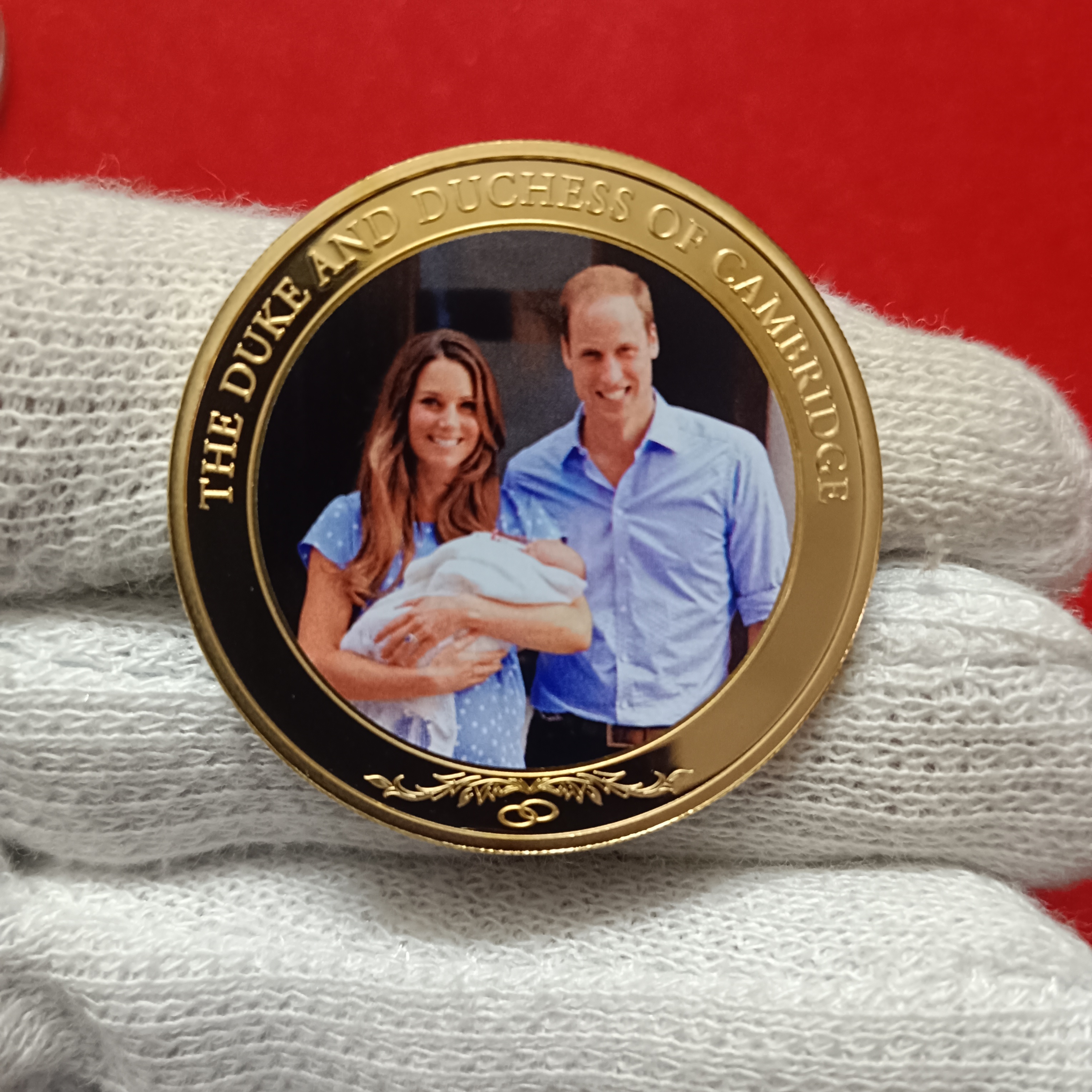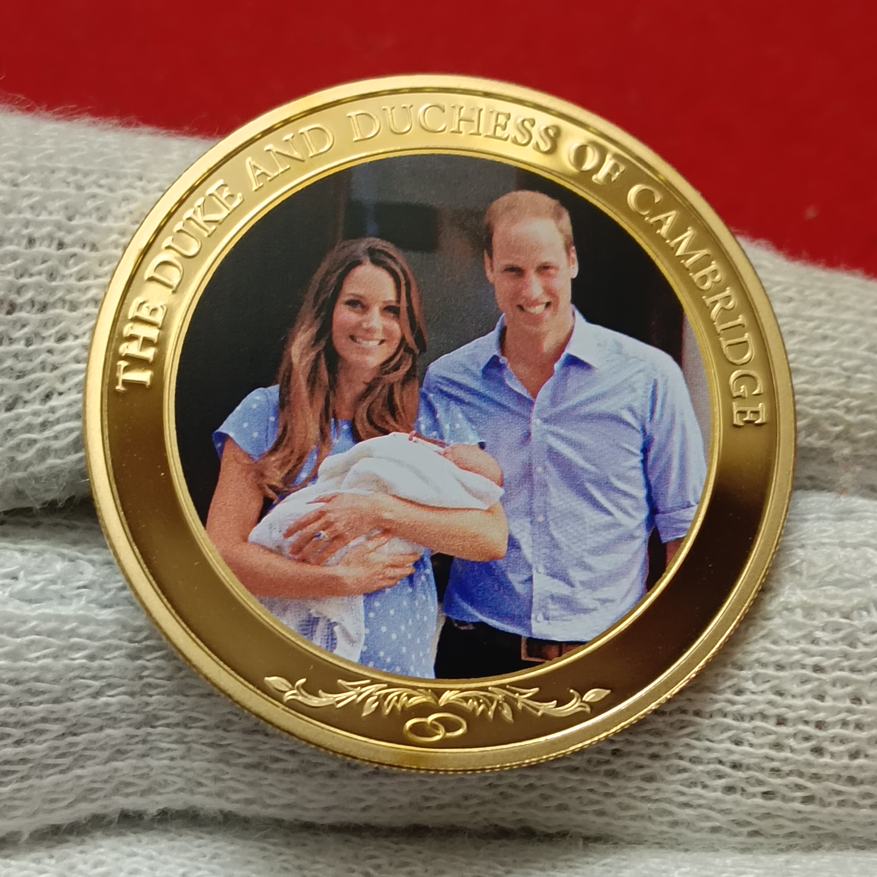 commemorative coin featuring Prince William and Catherine, the Duke and Duchess of Cambridge, with their first child, Prince George. This coin was issued to celebrate the birth of Prince George in 2013.