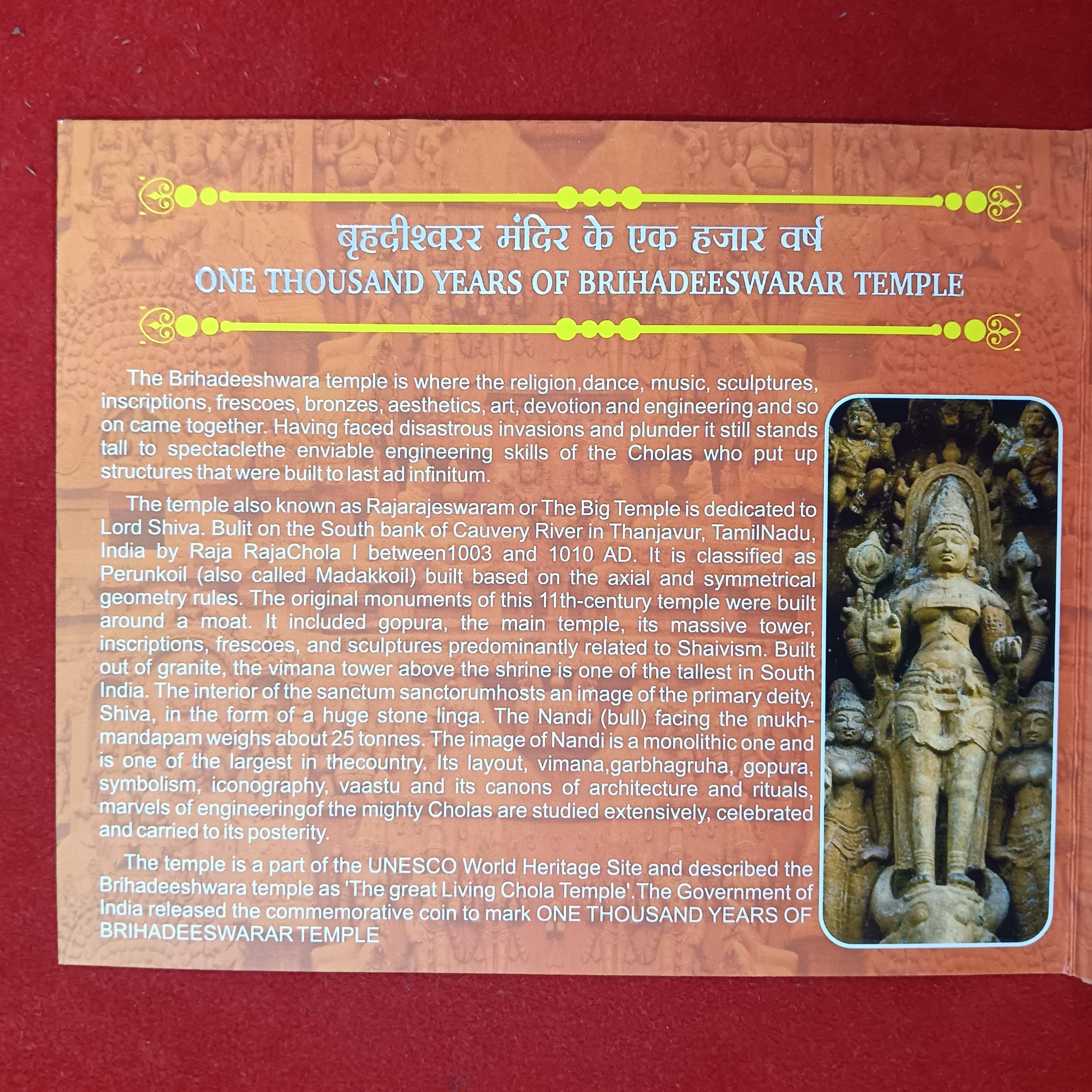 Immerse yourself in the rich history of India with this Five Rs Rare Set commemorating One Thousand Years of Brihadeeswarar Temple. Issued by the India Government Texal Hyderabad Mint, this collectible features a denomination of 5 Rupees. Minted in Hyderabad, this set holds a special significance due to its historical and cultural context. The design pays homage to the Brihadeeswarar Temple, a UNESCO World Heritage Site known for its architectural grandeur and spiritual importance.