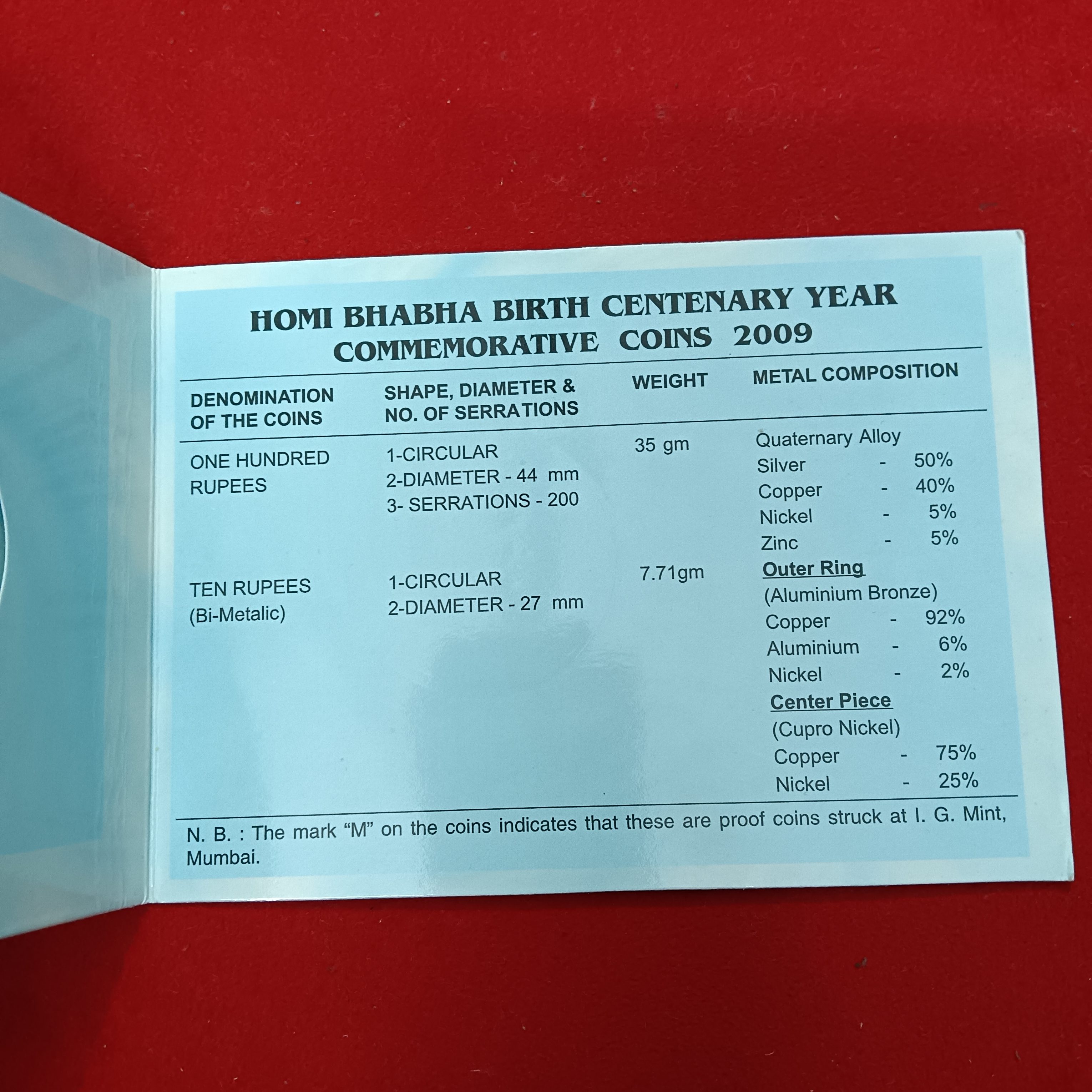 - Homi Bhabha Birth Centenary Year Commarative Coins 2009 Year Bombay Texal