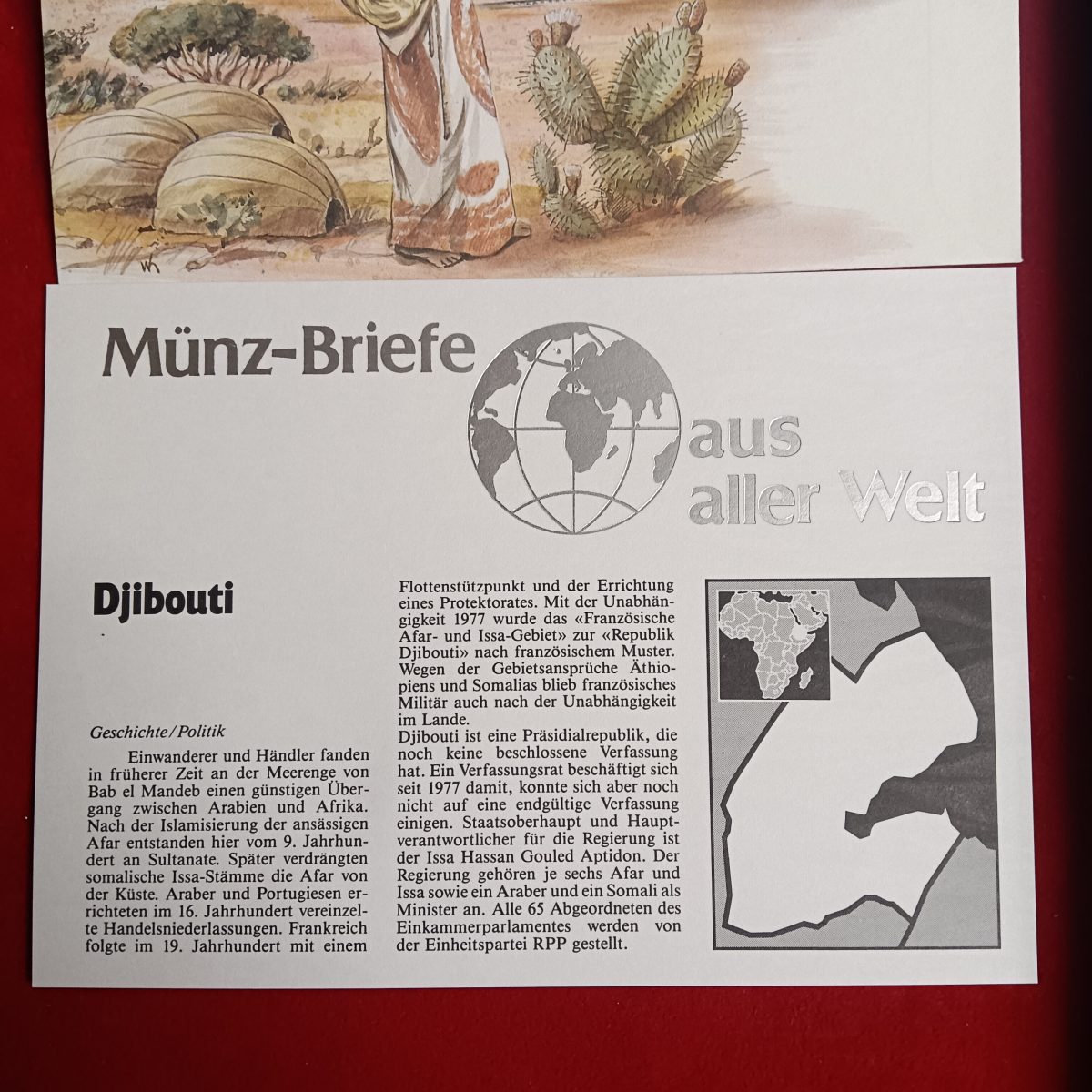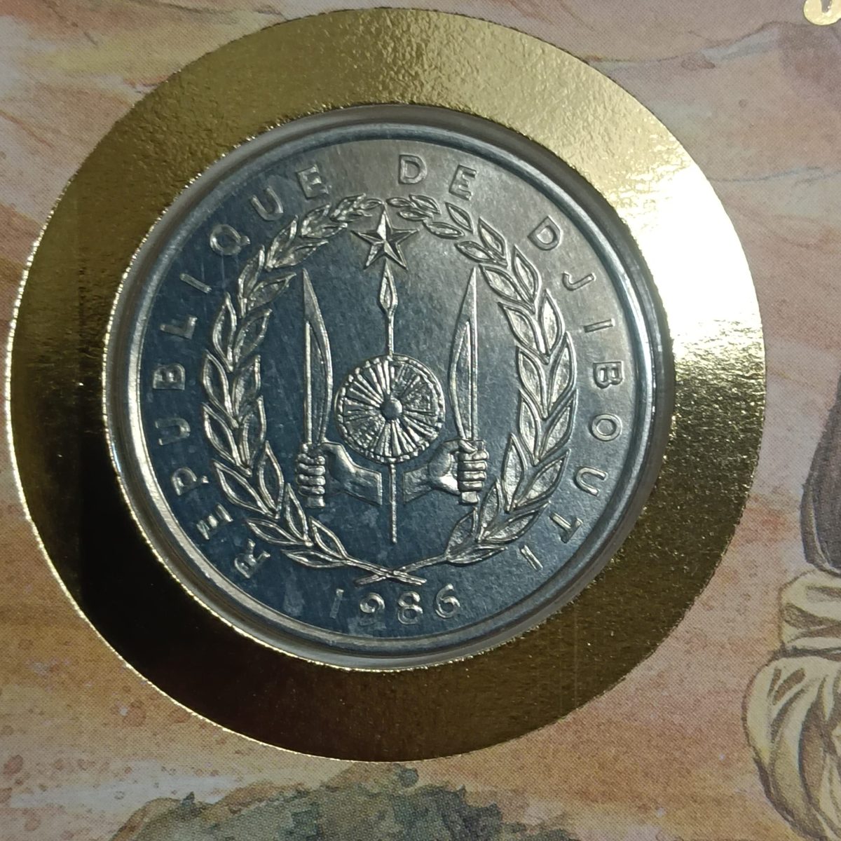 - Francs coin from Djibouti, issued in 1983, along with a commemorative stamp. The coin is made of aluminum. The Djiboutian franc (DJF) is the official currency of Djibouti
