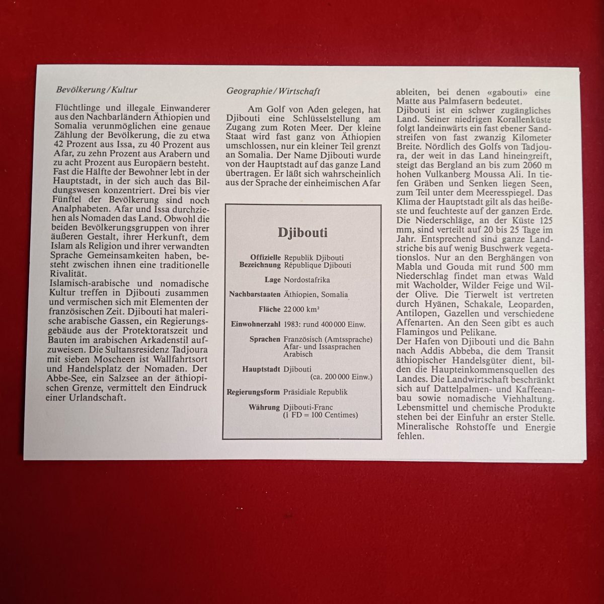 Indulge in the allure of this rare 5 Francs coin from Djibouti, a gem minted in 1986. Crafted in aluminum, this UNC (NEW) condition collectible comes accompanied by a commemorative stamp, making it a noteworthy addition to any numismatic collection. The Djiboutian franc (DJF), serving as Djibouti’s official currency, adds historical significance to this piece. With a limited mintage and exceptional preservation, this item stands out as a prized treasure for collectors and enthusiasts alike. Its rarity and unique pairing with the stamp elevate its collectible value, offering a glimpse into the cultural and monetary heritage of Djibouti.