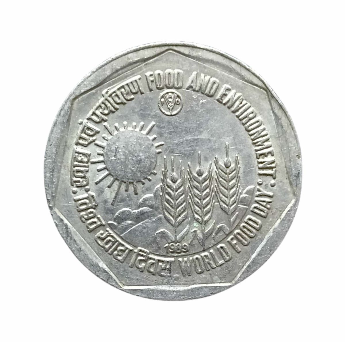 - Reverse: Depicts three wheat stalks with the sun and clouds in the background, symbolizing the relationship between food production and the environment. The inscriptions include “рдЦрд╛рджреНрдп рдПрд╡рдВ рдкрд░реНрдпрд╛рд╡рд░рдг” (Khadya Ebam Paryavaran) and “FOOD AND ENVIRONMENT,” along with “рд╡рд┐рд╢реНрд╡ рдЦрд╛рджреНрдп рджрд┐рд╡рд╕” (Vishwa Khadya Divas) and “WORLD FOOD DAY.” The year “1989” and the FAO emblem are also present.