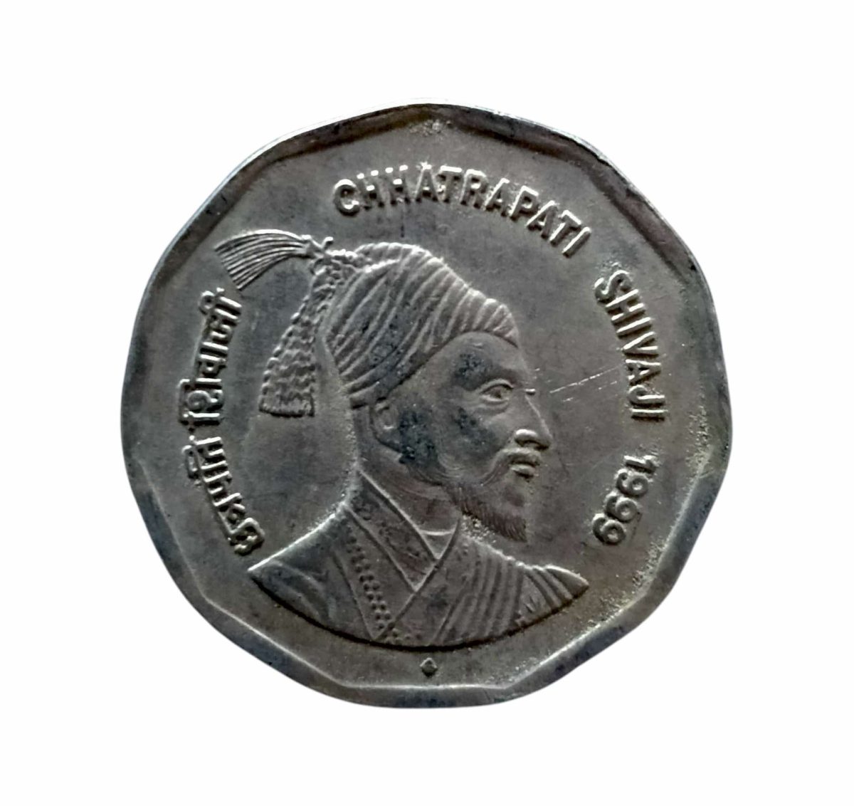 - Reverse: Depicts a right-facing bust of Chhatrapati Shivaji Maharaj, adorned with a turban. The inscriptions include “рдЫрддреНрд░рдкрддрд┐ рд╢рд┐рд╡рд╛рдЬреА” in Hindi and “CHHATRAPATI SHIVAJI” in English, along with the year “1999”.