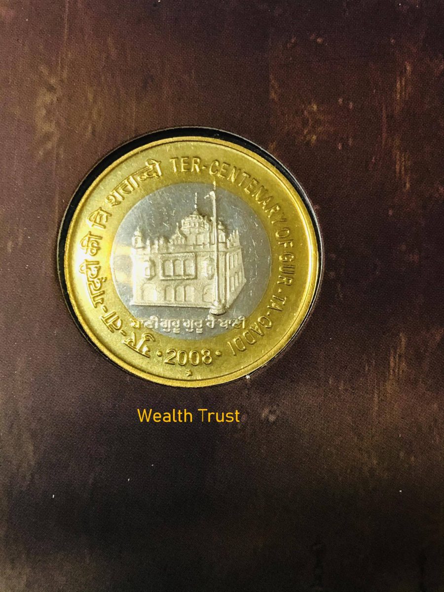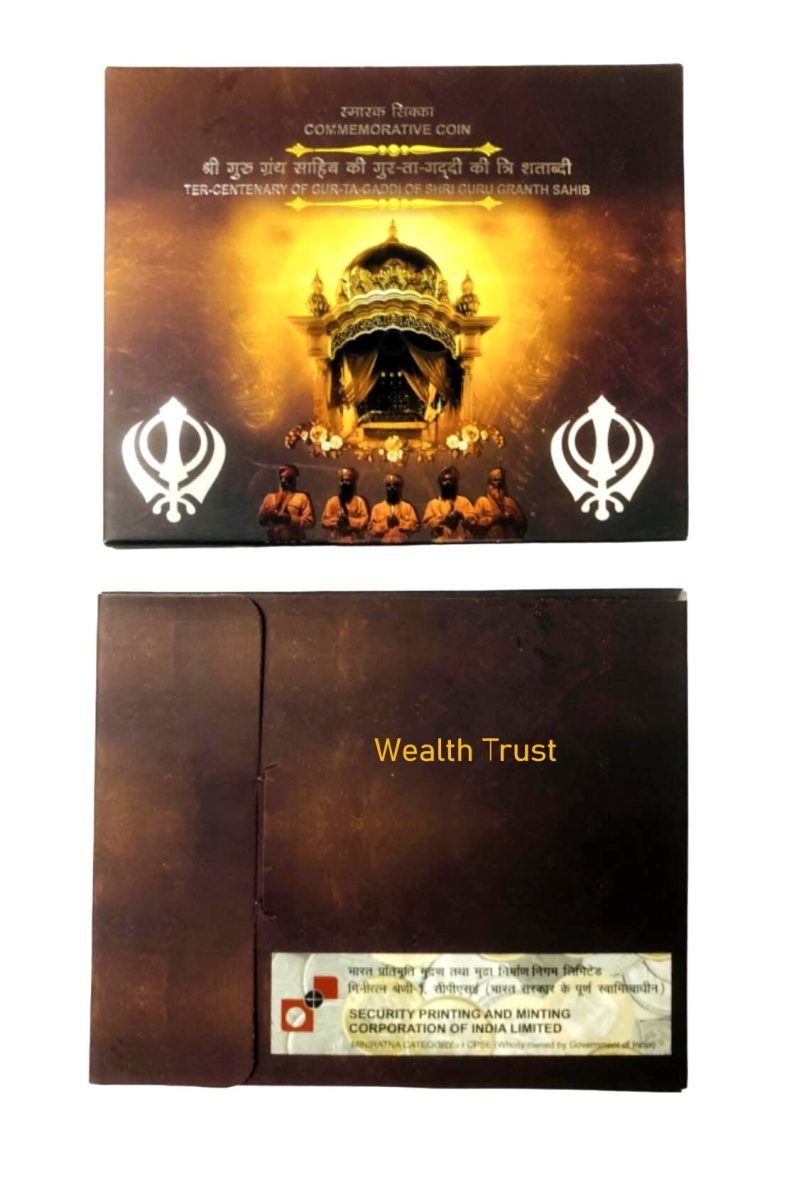 Commemorative issueRs 10 Hyderabad Mint Ter Centenary Of Gur Ta Gaddi Of Shri Guru Granth Sahib Unique and Rare ObverseLion Capital of Ashoka Pillar, denomination below. Lettering: Translation: Truth alone triumphs ReverseEdgePlain |