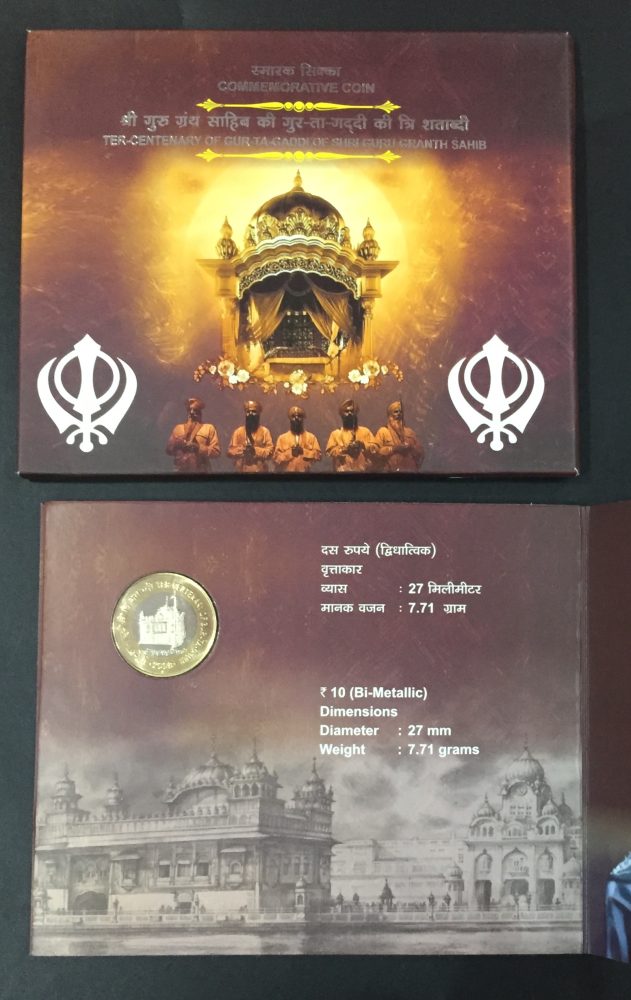Celebrate the Ter-Centenary of Gur-Ta-Gaddi of Sri Guru Granth Sahib with this exceptional UNC (NEW) mint packing set. Issued with reverence, this collectible set commemorates a significant milestone in Sikh history. The set includes special coins or banknotes that pay homage to the teachings and guidance of Sri Guru Granth Sahib, showcasing intricate designs and symbols that hold deep cultural and spiritual significance. Each piece is meticulously crafted to preserve its mint condition, making it a treasure for collectors and enthusiasts alike. The rarity of this set, coupled with its historical importance, elevates its collectible value, making it a prized addition to any collection. Packaged with care and authenticity, this set is a testament to the enduring legacy of Sri Guru Granth Sahib.