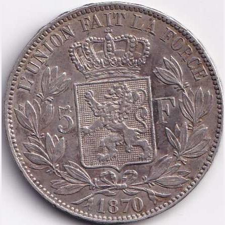 1870 Belgium 5 Francs – Léopold II small head Silver Weight 25 g Big Size Crown Size Coin