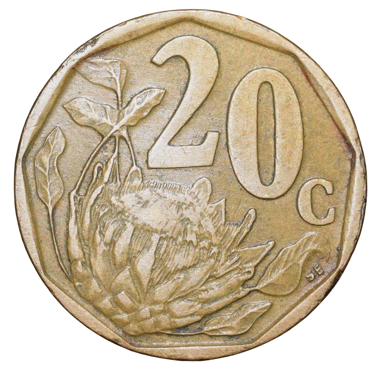 Aluminium-Brass 20 Cents of South Africa (AD 1997) with Protea flower within sprigs
