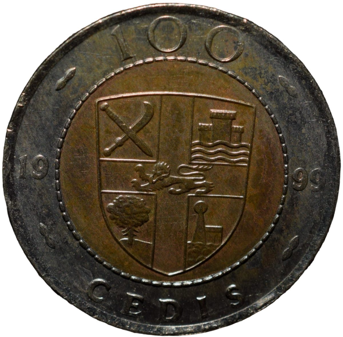 Bi-Metallic 100 Cedis of Ghana Country (AD 1999) with Cocoa Plants