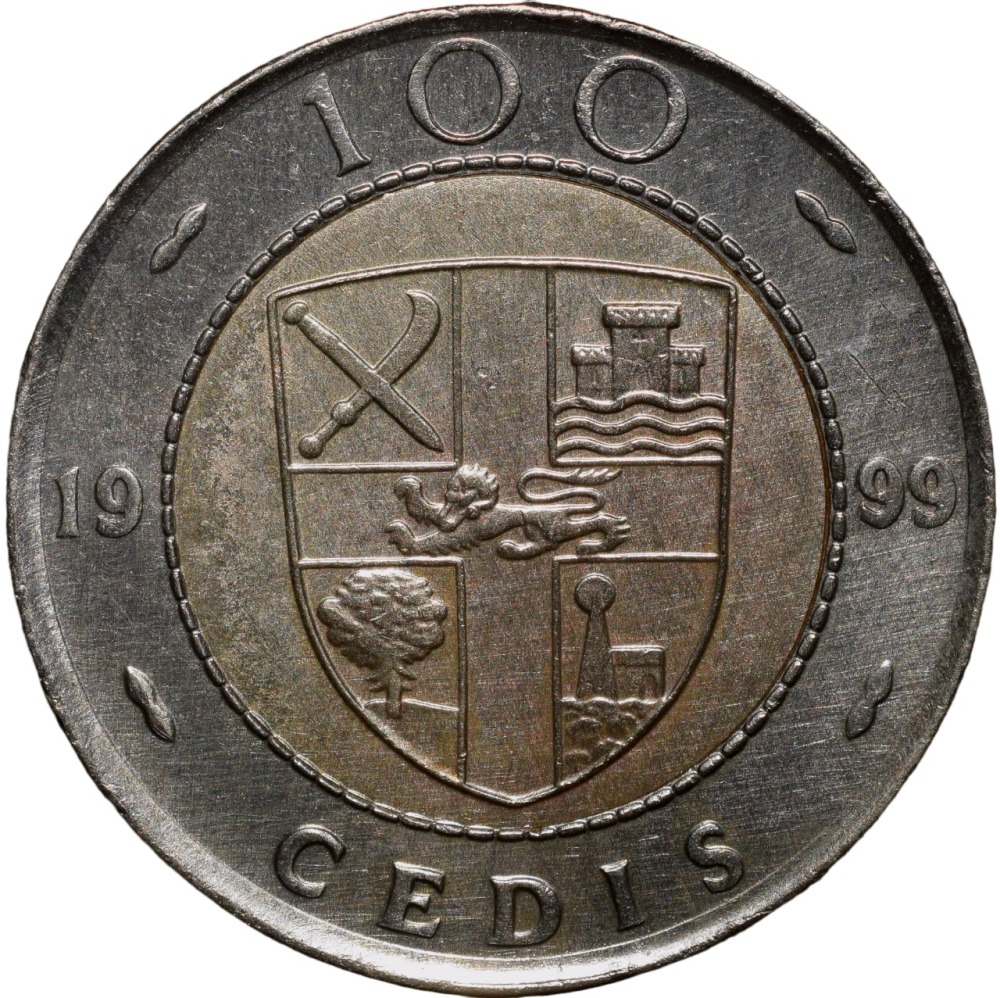 Bi-Metallic 100 Cedis of Ghana Country (AD 1999) with Cocoa Plants