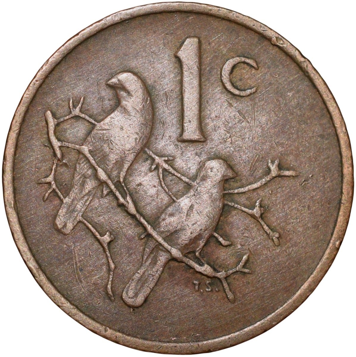 Bronze 1 Cent of South Africa (AD 1970) with Cape sparrows