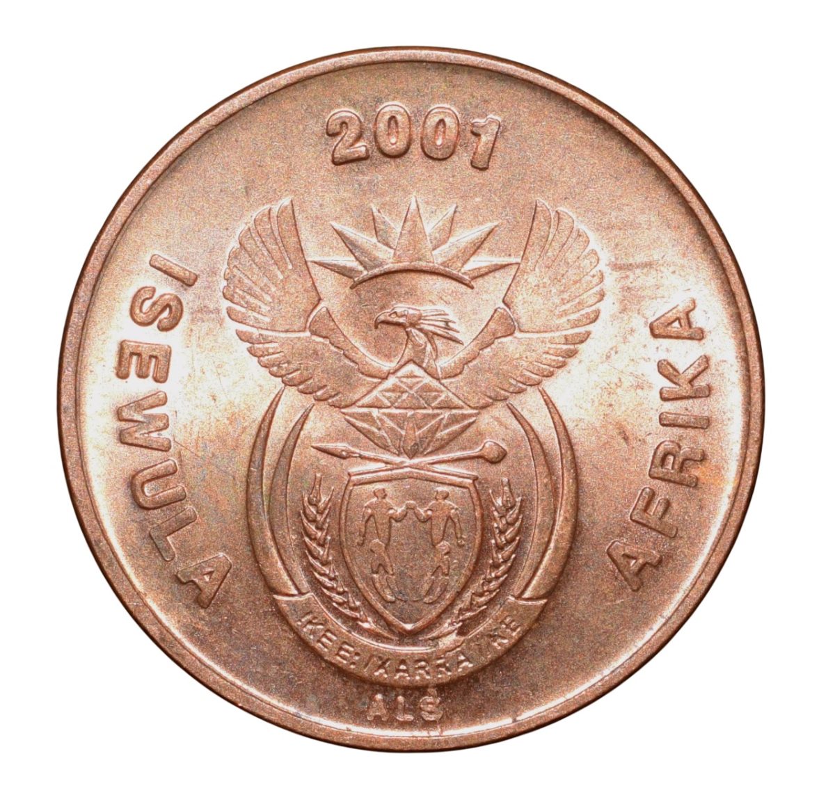 South Africa, ( AD 2001), Bronze 1 Cent, Obv: South Africa coat of arms with the motto in Bochimans. Country name in Ndebele language, Rev: Cape sparrows, 1.25 Gms, 16.19 mm, UNC Grade.
