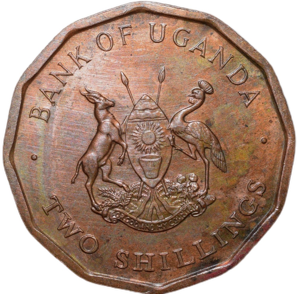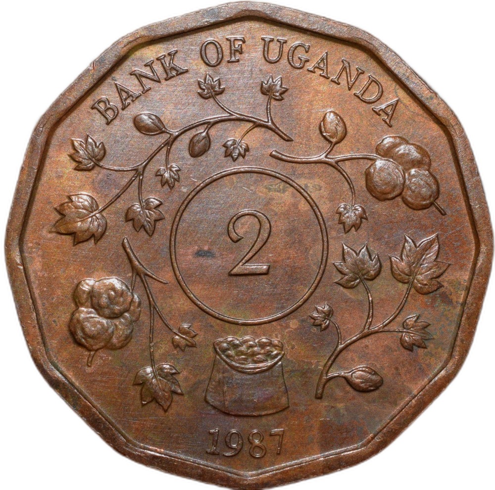 Bronze 2 Shillings of Uganda Country (AD 1987) with Coat of Arms/Floral Design