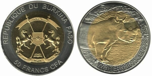 BURKINA FASO, 50 Francs CFA, 2017, White Rhinoceros, KM #116, Bimetal, UNC Condition.