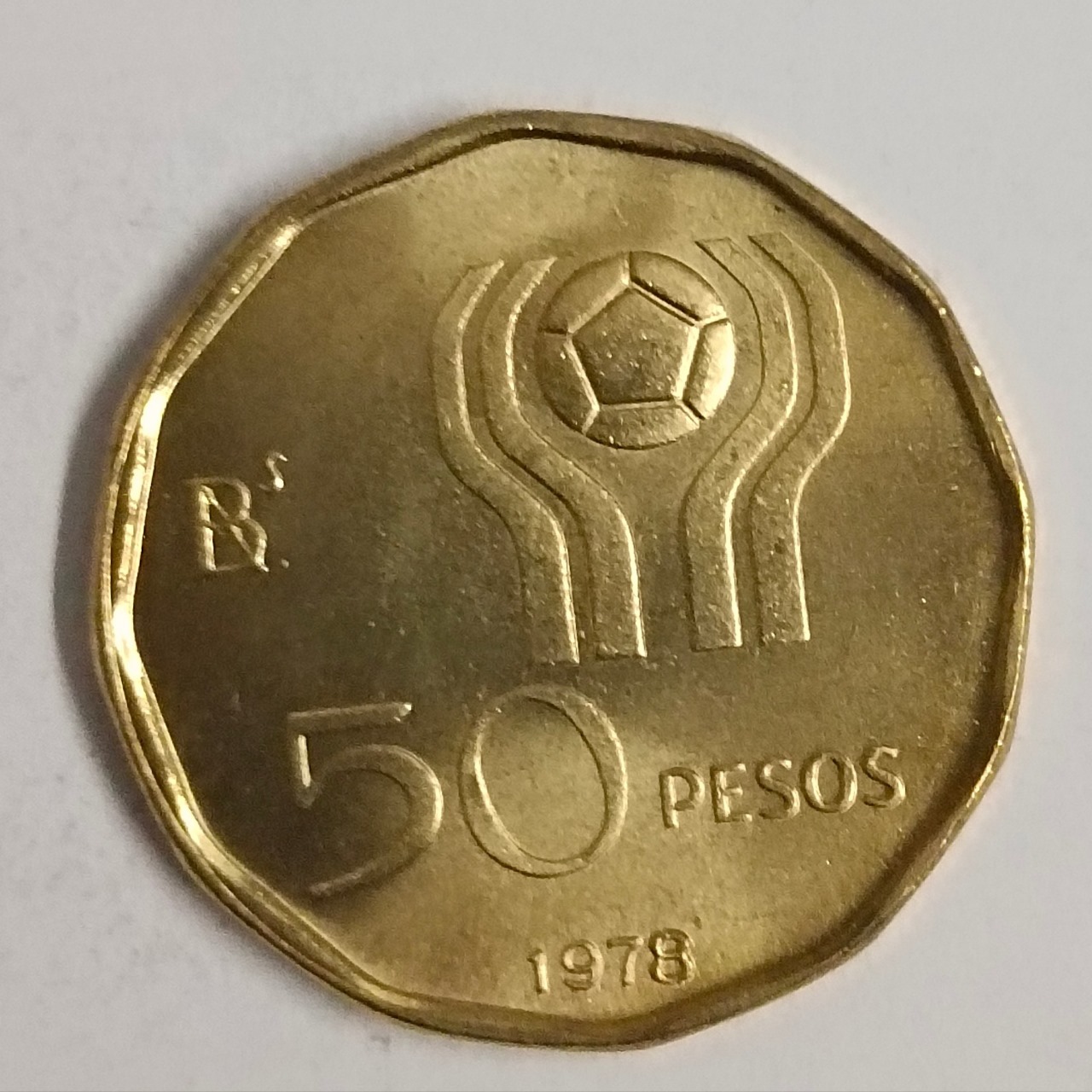 Step into the world of football history with this remarkable collectible: Argentina 50 Pesos from 1978. Issued to commemorate the 1978 World Soccer Championship, this coin is a true gem for sports enthusiasts and numismatists alike. Crafted from aluminium bronze, this 5.75 grams coin features a dodecagonal shape, adding a unique touch to its design. The 23.50mm diameter and 1.959mm thickness give it a substantial presence in any collection.