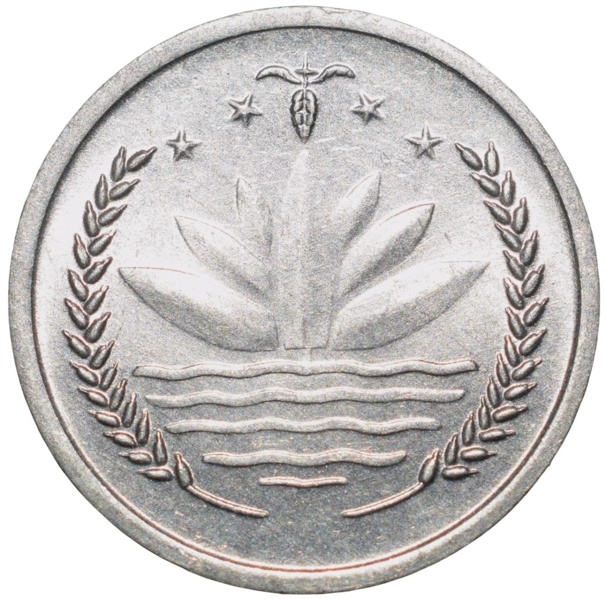 Bangladesh, (AD 1974), Aluminium 1 Poisha, Obv: The National Emblem of Bangladesh (a water lily bordered on two sides by rice sheaves and a three-leaf clover of tea leaves above and four stars representing the four principles of the first constitution of Bangladesh in 1972: nationalism, secularism, socialism, and democracy), Rev: Face value in text form and the word “Bangladesh”, 0.51 Gms, 16.00 mm, UNC Grade.