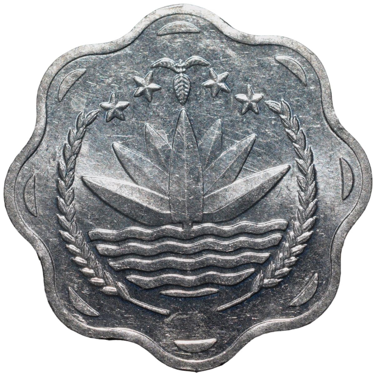 Bangladesh, (AD 1994), Aluminium 10 Poisha, Obv: The National Emblem of Bangladesh (a water lily bordered on two sides by rice sheaves and a three-leaf clover of tea leaves above and four stars representing the four principles of the first constitution of Bangladesh in 1972: nationalism, secularism, socialism, and democracy), Rev: A family with two kids sitting face to face. The word “Bangladesh” and the face value in figures and in full., 2.00 Gms, 24.00 mm, UNC Grade.