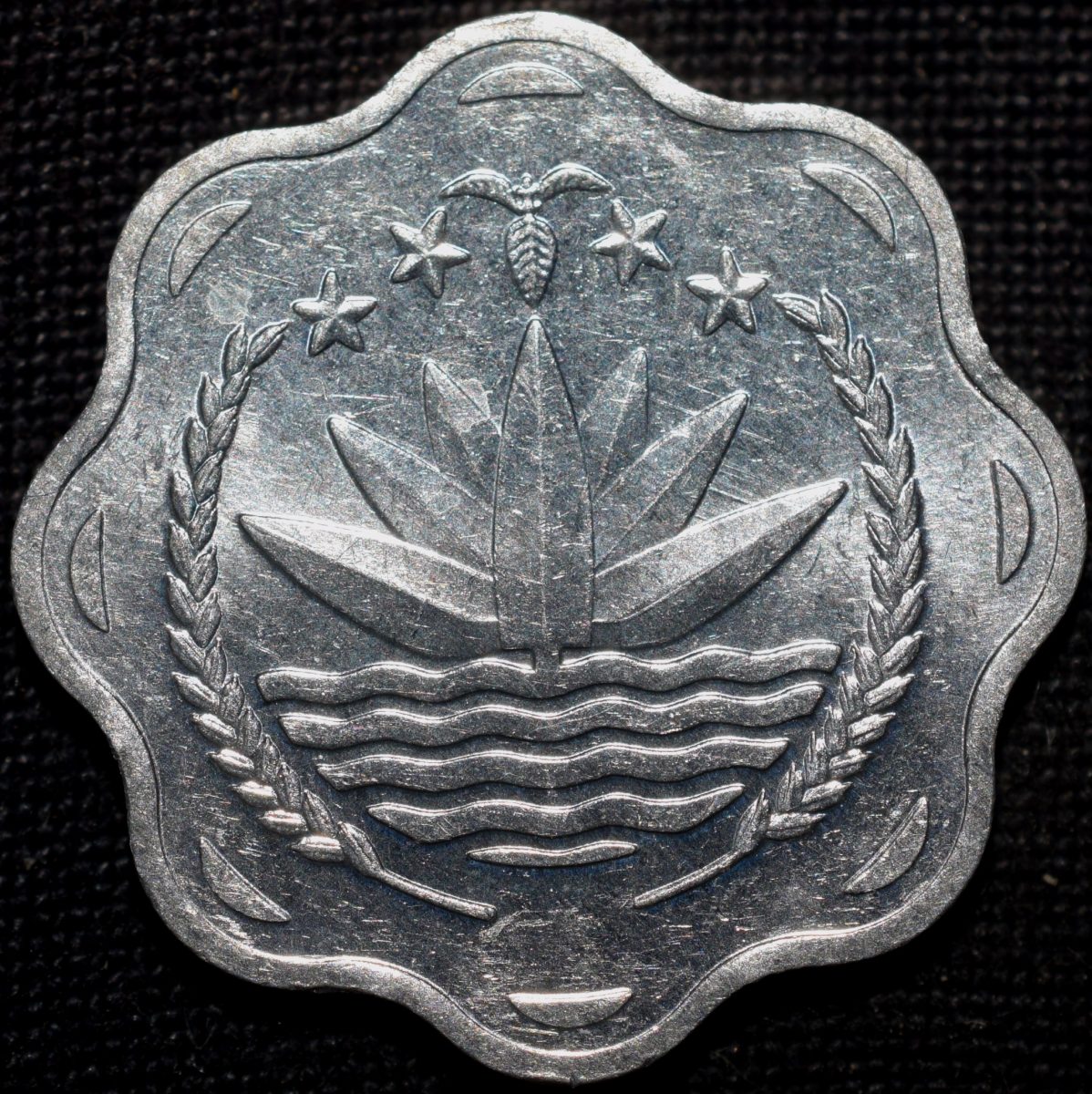 Bangladesh, (AD 1994), Aluminium 10 Poisha, Obv: The National Emblem of Bangladesh (a water lily bordered on two sides by rice sheaves and a three-leaf clover of tea leaves above and four stars representing the four principles of the first constitution of Bangladesh in 1972: nationalism, secularism, socialism, and democracy), Rev: A family with two kids sitting face to face. The word “Bangladesh” and the face value in figures and in full., 2.00 Gms, 24.00 mm, UNC Grade.