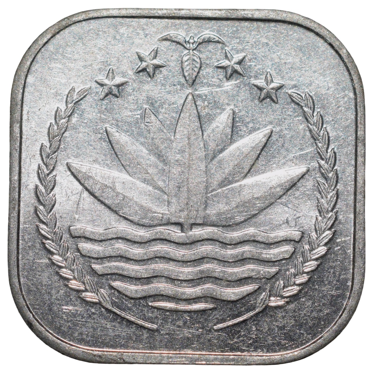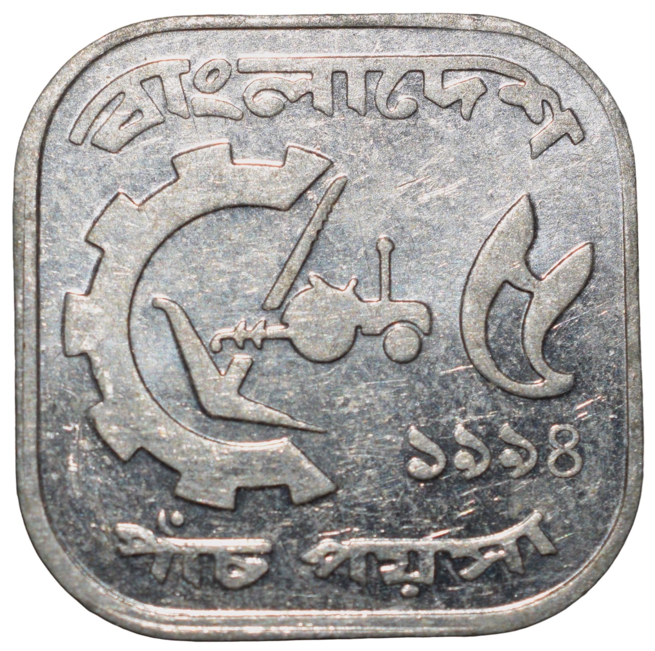 Bangladesh, (AD 1994), Aluminium 5 Poisha, Obv: The National Emblem of Bangladesh (a water lily bordered on two sides by rice sheaves and a three-leaf clover of tea leaves above and four stars representing the four principles of the first constitution of Bangladesh in 1972: nationalism, secularism, socialism, and democracy), Rev: A gear, a swing plow and a tractor pulling a plow with the country name above and the denomination above the date to the right and the face value below, 1.40 Gms, 22.40 mm, UNC Grade.