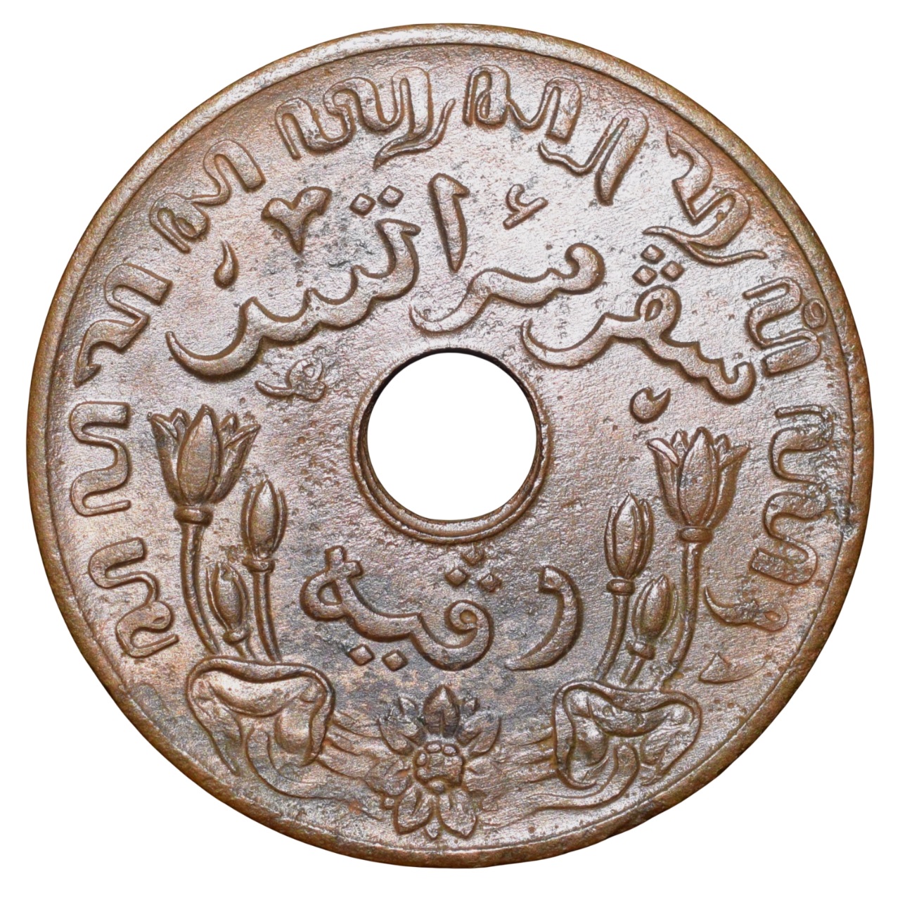 Indonesia – Nederland East India, (AD 1945), Bronze 5 Cents, Obv: Rice plant, legend above, denomination below, Rev: Floral elements at the bottom, legend in Javanese around the border and in Malay in Jawi script around the central hole, 4.00 Gms, 23.50 mm, Extremely Fine, Rare.