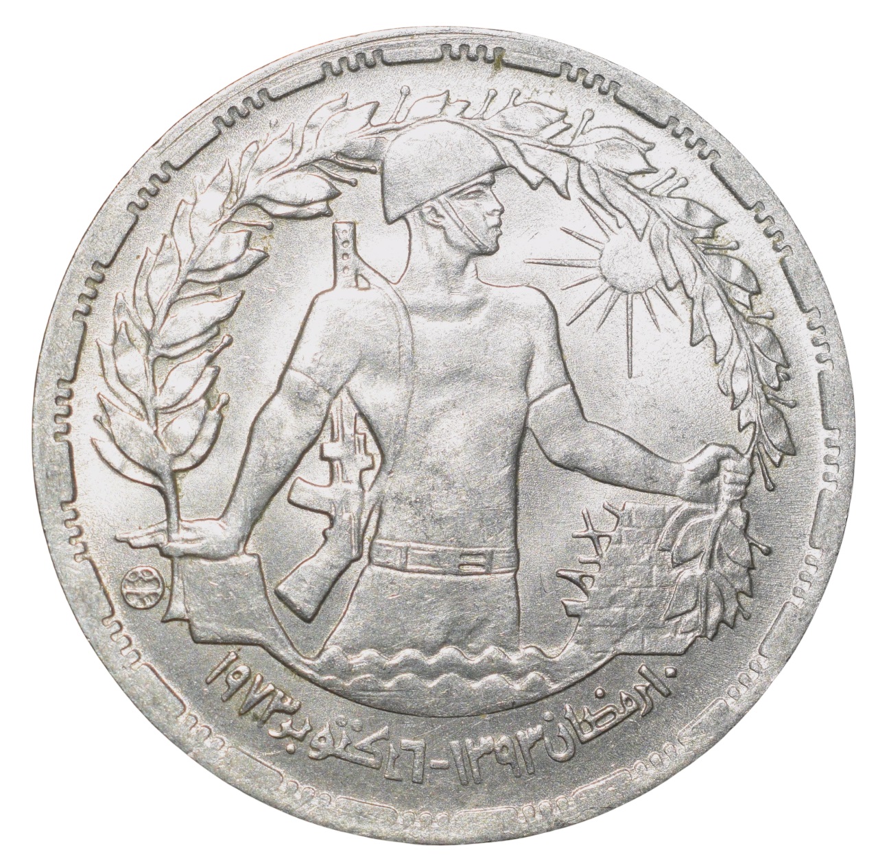 Egypt Country, (AD 1973), Copper-Nickel 10 Qirsh, Commemorative issue ‘First Anniversary – October War’, Obv: Wreath above 3/4 fi gure of soldier, dates below, Rev: Denomination divides dates, legend above, 6.00 Gms, 27.00 mm, UNC Grade, Scarce.
