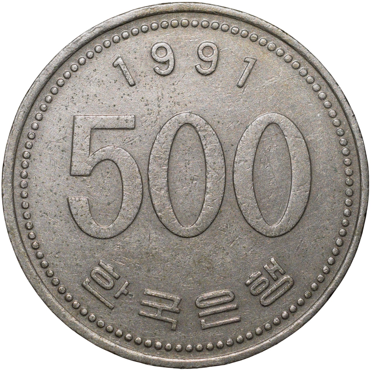 South Korea, (AD 1991), Copper-Nickel 500 Won, Obv: Flying Manchurian crane and the value below in Korean, Rev: The value in numerals below the date and above the issuer name, in Korean, 7.70 Gms, 26.50 mm, About Extremely Fine.