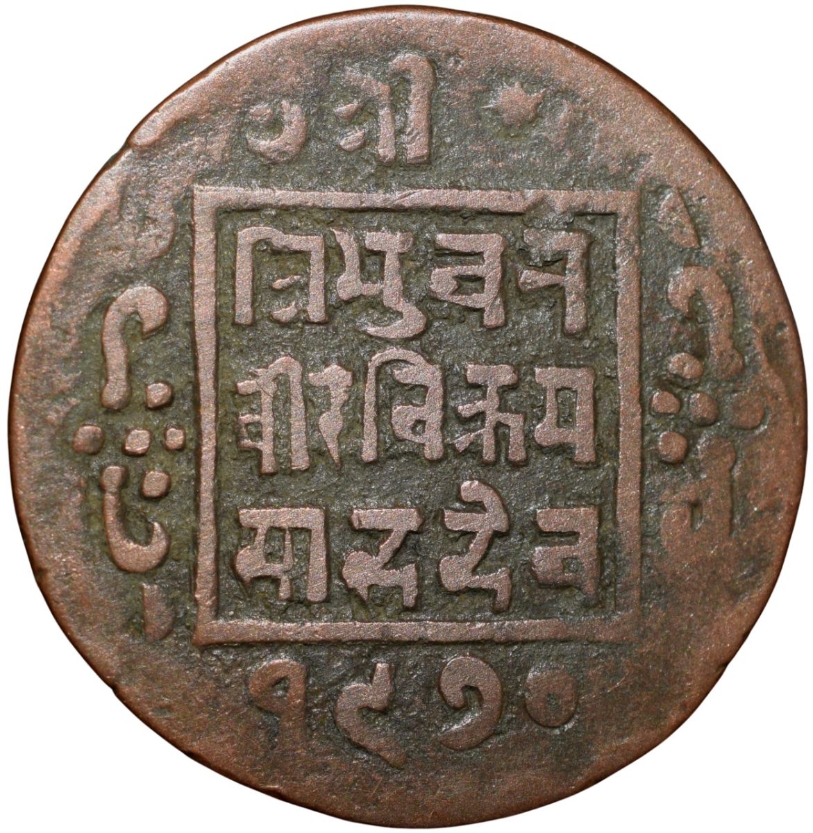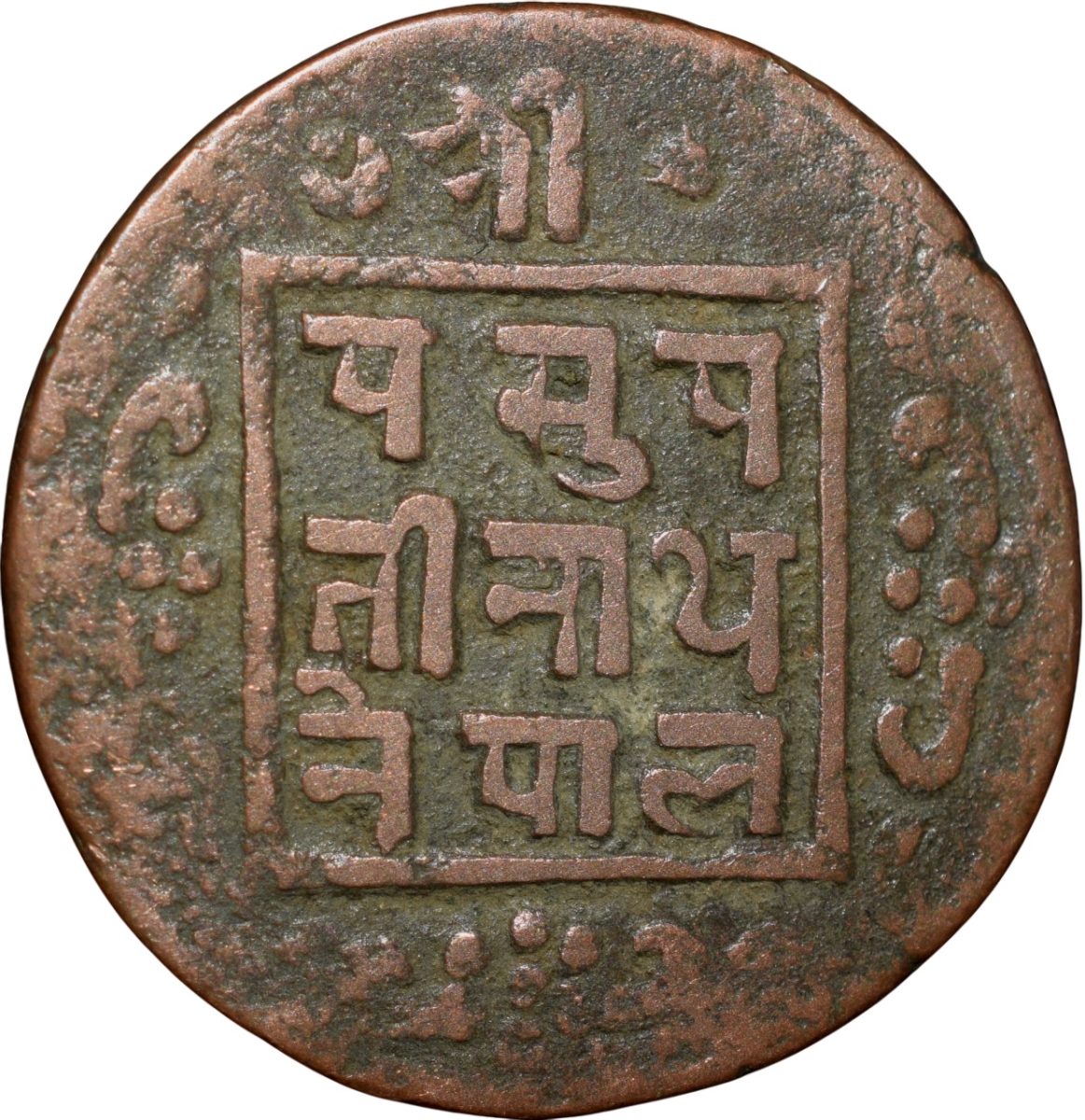 Nepal, Tribhuvan Vira Vikrama, (VS1968-2007/1911-1950AD), Copper Paisa, Obv: Nagari legend within square Tribhuvan Vira Vikrama sahadeva, Date bottom, Rev: Nagari legend within square Pasupatinath Nepal, 5.56 Gms, 22.62 mm, Extremely fine, Rare.