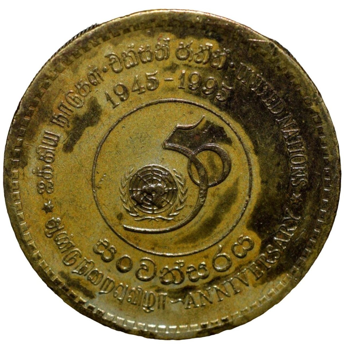 Nickel-Brass 5 Rupees of Sri Lanka (AD 1995) Commemorative 50th Anniversary