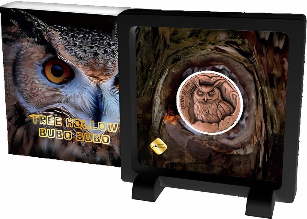 This wonderful Copper coin celebrates the Eurasian Eagle-Owl, known scientifically as “Bubo Bubo”, a nocturnal bird of prey that typically nests in tree hollows! The coin is the first issue of the series “Tree Hollow”, has a stunning design, Ultra-High Reliefs, and an Antique Finish quality. It comes in a case, with the Certificate of Authenticity. Limited mintage of 3.000 pieces!