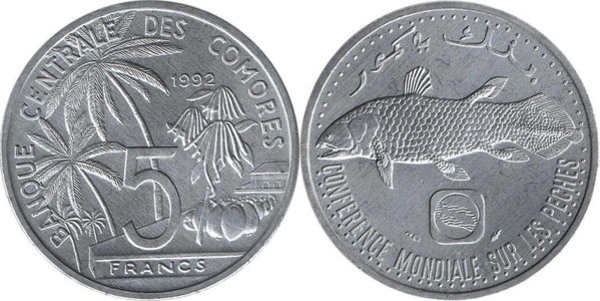 Comoros, 5 Francs, 1992, FAO – World Fisheries Conference, KM# 15, AUNC Condition.