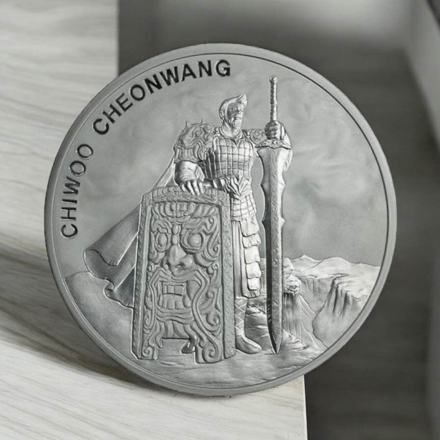 Indulge in the exquisite beauty of the 1 Clay 2019 1 Oz Proof Set Korea 9999 Silver Chiwoo Cheonwang. This stunning collectible, minted in South Korea in 2019, features a high-quality .999 silver composition, weighing 31.1g and measuring 40mm in diameter. The obverse showcases the Shield of Chiwoo Cheonwang with intricate details and security features, while the reverse depicts Chiwoo Cheonwang in military attire, symbolizing strength and valor.