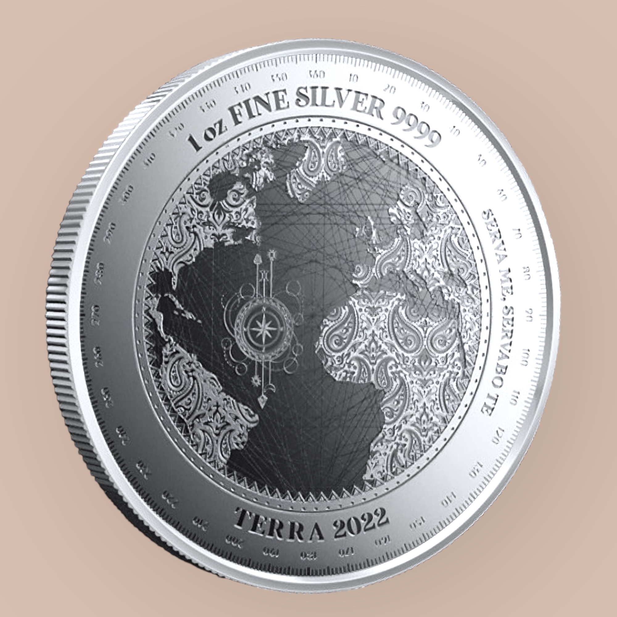 The reverse carries the same patterns and themes. This time, the part of the world map depicted is the Atlantic region, including parts of the continents of North and South America, Europe and Africa. An elaborately styled compass rose takes up much of the area of the Atlantic, and the same paisley and grid patterns are used to separate land and water. Both sides of the coin have a border that’s designed to look like a compass gauge, including degrees from 1 to 360 indicated with tick marks. The reverse includes an inscription in Latin that means save me and I’ll save you (or protect me and I’ll protect you). The phrase is meant to describe the symbiotic relationship humanity and Earth have.