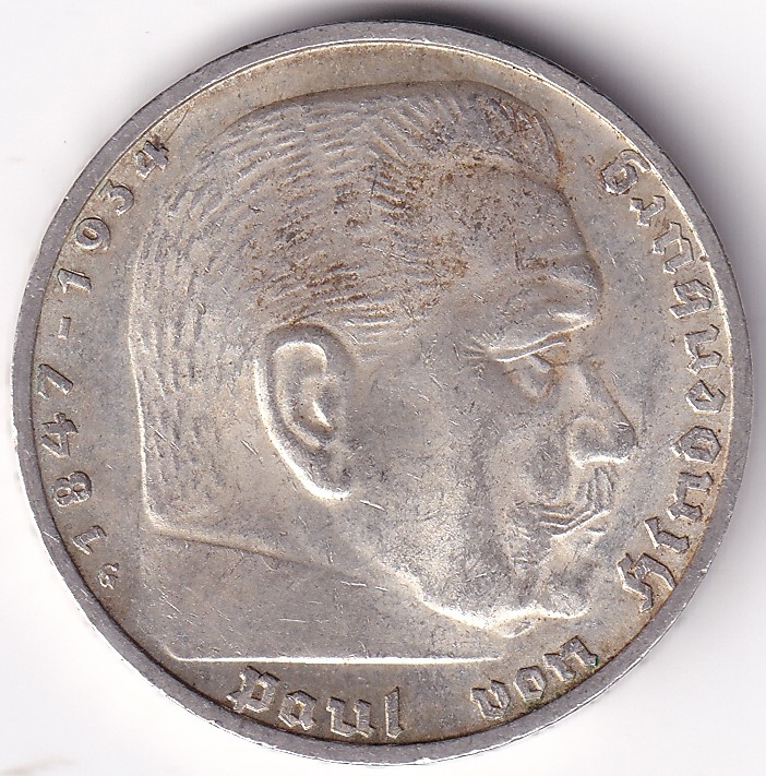 5 Mark Germany 1936 卐 Karlsruhe Mint G Silver Coin Rare