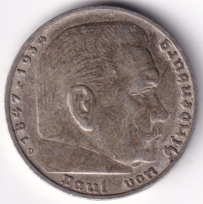 5 Mark Germany 1936 卐 Munich Mint D Silver Coin Rare